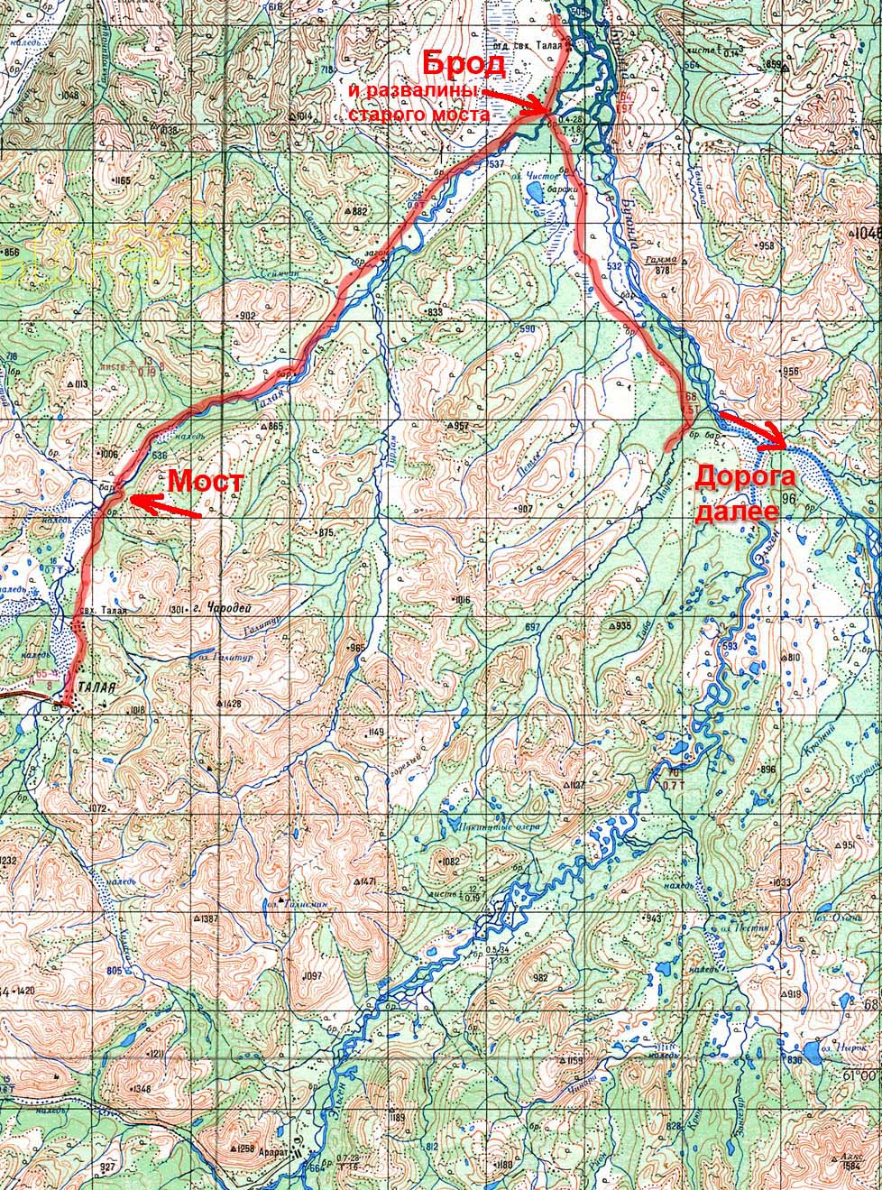 Дорога от пос. Талая отличная, в малую воду пройдет любая легковушка. На фото: тальская дорога, все еще живой мост и рядом брод для большегрузов Доехав до развалин Тальского совхоза возле Бюнды попробовали потыкаться по тамошним дорожкам в поисках подъезда к какой-нибудь протоке. Все направления вели либо на старые заросшие поля, либо в сомнительного вида говны. Копать никто не хотел - в итоге решили остановиться возле брода через Талую неподалеку от развалин старого моста Пока мои занимались рыбалкингом и прочим подобным решил на велике "прогуляться" и разведать дорогу далее вверх по Буюнде. Цель была узнать наличие/отсутствие/состояние старой дороги идущей от устья руч. Маут до озера Маут и вроде как далее с выходом на р. Эльген. Собственно вопрос знатокам. Кто знает куда именно ведет эта волшебная дорога??? Одни говорят что на Нявленгу, где у Басанского прииск, другие - что на Килгану и с возможным дальнейшим выходом на Омсукчанскую трассу (кстати оба этих варианта присутствуют картах 2-киллометрового мастштаба). Сообщение отредактировал ziv - 6.7.2009, 0:43 Спасибо! — crazybubble