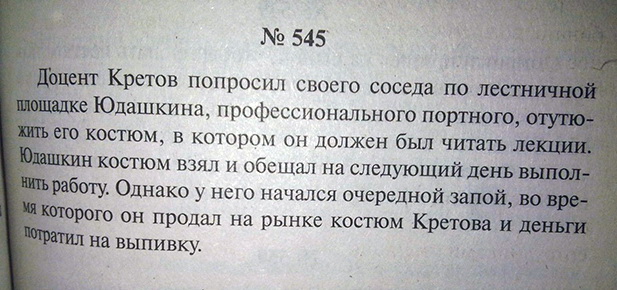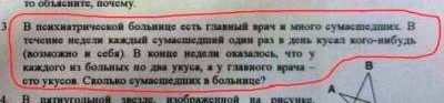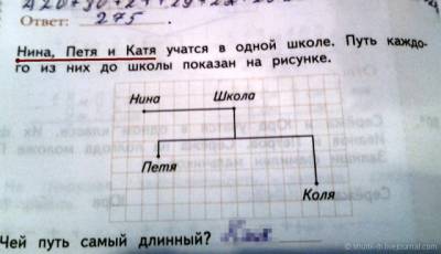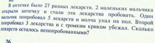 А некоторые из этих задач те люди, которые делали эти снимки и обводили красным, видимо просто не поняли. К примеру задачку про безмозглых мужчину и женщину, не заметив перед ней про альдебаранского ноздрехвоста. В биологии не силён, однако про доминантные и рецессивные признаки с наследованием через одно поколение что-то там было (Дудинцева читал... всё моё образование), поэтому вполне возможно, что это нормальные задачи, просто с прицелом на абстракцию. К огромному сожалению, обрезано решение задачки про Сатану, который походя мерял плотность водки: меня очень заинтриговало то, как его скорость связана с точностью измерения. П.С. [attachment=228161:___002_77________.jpg] Купили книгу (X), альбом (Y) и тетрадь (Z). За всё без тетради заплатили 75р.: X+Y=75. Книга стоит 40 р.: X=40. Сколько стоит альбом? Y=75-40=35. Сколько стоит тетрадь? - Условия задачи не позволяют ответить. В чём проблема? Задачка учит подходить к вопросу не тупо, а осмысленно. П.П.С. Про таджика и сварившихся в кипятке соседей - ну, это, пожалуй, перегибы, спорить не буду. Опять же, про таджика это какая-то "Карточка". Откуда карточка - из официального учебника? или из самопальной методички конкретного учителя? Сообщение отредактировал Гидр - 14.10.2015, 21:24 -------------------- Разница других исполнителей, которые пытались перепеть эту песню, в том, что они поют как будто идут на войну, а Цой - будто вернулся оттуда.