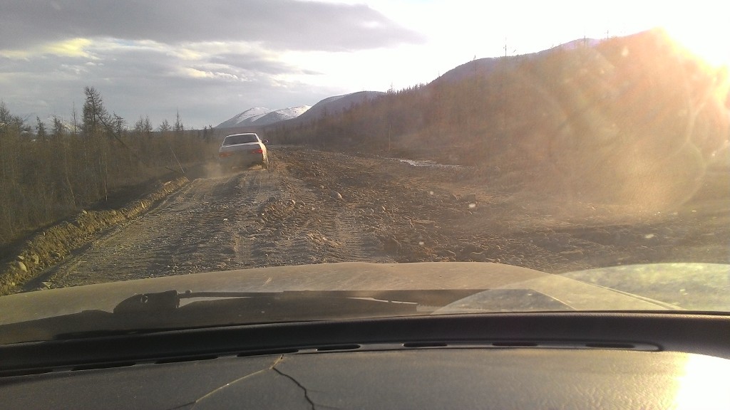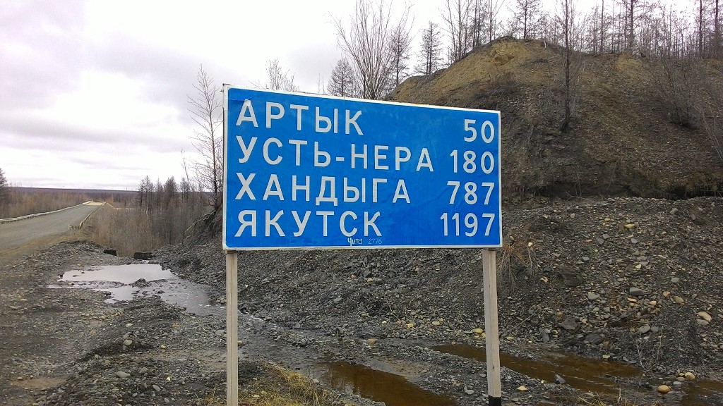 Родственники дали в дорогу целый пакет разного провианта и термос с чаем, что было не обязательно, но все равно пригодилось. О важных вещах типа зубной щетки, комплекта сменного белья и флешки с музыкой даже и говорить не нужно, само собой разумеется. Все четырежды перепроверив (видимо 4 мое счастливое число, слишком уж часто всего по 4), я отправился в гараж к друзьям отмечать мой отъезд при помощи коньяка. Вообще, кому бы я не говорил о своих намерениях проехать страну на своем автомобиле, все на меня, в лучшем случае, смотрели как на дурачка. Лишь пару человек не усомнились в моих планах. Ну что ж, утритесь, сомневающиеся — путь был успешно завершен! Но обо всем по порядку. Дальше будет очень много букв, надеюсь будет нескучно. Одометр от старта, пробег вообще смешной День первый. Вперед на Север. 25 мая 2015. Магадан — Сусуман Пройдено 630 км. Всего — 630 км. План выехать в 6 утра с треском провалился — я проспал, слишком уж хорошо проводили. На утренний чай и общий сбор ушло полчаса. Выехал в 8 утра по Магаданскому времени. Компанию мне составило легкое похмелье, после вечеринки-провожалки. Первая заправка состоялась еще в Магадане в день перед выездом — на 2000р получился полный бак, а что не влезло в бак залил канистры. Долгая дорога до Якутска Так как ехал я в первый раз, а до этого дальше двухсот километров от города вообще никогда не выезжал, я слегка переживал по поводу предстоящего пути, к тому же ехал я один и среди своих земляков выдвинулся самый первый. Первые 100-120 км были знакомыми и пройти их не составило труда, хорошая асфальтовая дорога закончилась за поселком Карамкен, там асфальт стал плыть и обрастать ямами, а ближе к поселку Атка и вовсе закончился. Через 200 км от Магадана стоит поселок Атка, выглядит он довольно мрачно, но там еще живут люди. Там же я первый раз заправился. Дальше меня ожидала легкая тряска километров 20, потом дорога стала ровной, а на 310км меня ждал сюрприз — 15 километров нового ровного асфальта возле моста через реку Нямичан. Потом очень ровная грунтовка. В нескольких километрах от п.Атки. Следующий поселок был Оротукан (400км от Магадана), там же и следующая заправка. Топливо стало стремительно дорожать. В Оротукане 92ой бензин стоит на 10 рублей дороже чем в Магадане — 50.40р. Так как в области, да и вообще до южной Якутии, заправки попадаются не часто, старался по возможности везде заправляться до полного бака на каждой попадавшейся мне АЗС. Залил 18 литров, сделал пару кадров и двинул дальше. Оротукан. Он такой весь Через чуть больше чем 100км следующий поселок - Ягодное. Этот поселок считается одним из наиболее живых поселков, и он производит такое впечатление. Большинство домов покрашены в яркие цвета, по улицам ходят люди. Там есть и АЗС, но заправляться в Ягодном я не стал, потому как наверняка знал, что до следующей заправки, а так же места моего первого ночлега, осталось совсем немного. По фото не очень это видно, но выглядит поселок очень неплохо Первую остановку было решено сделать в единственном в магаданской области городе (кроме Магадана) — Сусумане. Время уже было почти семь вечера, до следующего населенного пункта, Усть-Неры, которая уже в Якутии, около 400км по совершенно неизвестной мне дороге. Путешественник я неопытный, потому решил отдохнуть, а в 6 утра в дорогу. В Сусумане живет около 5000 человек и наверняка там