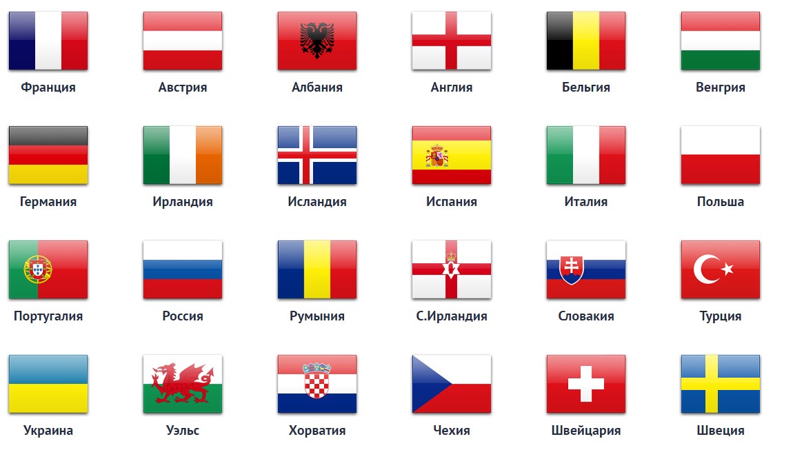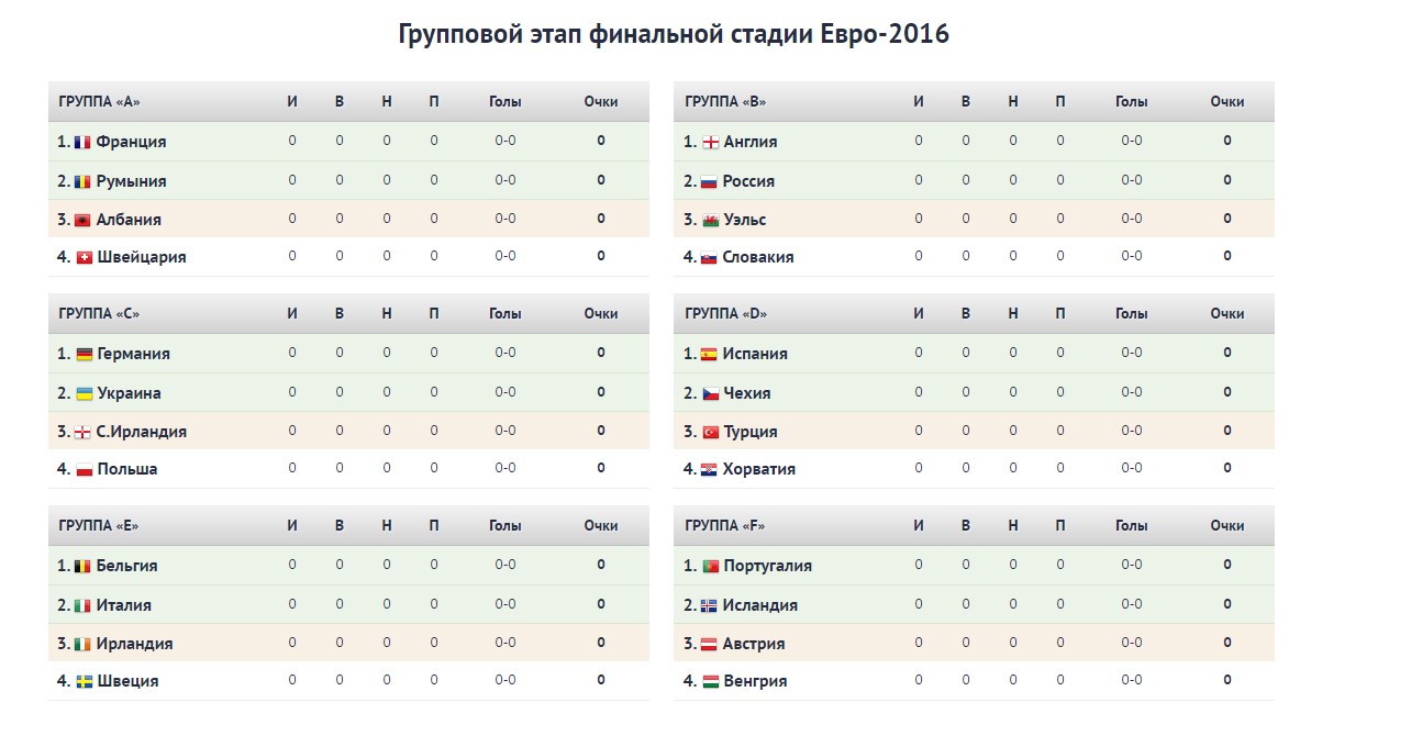 Групповой раунд Время начала матчей — московское 10 июня 2016, пятница Франция-Румыния 22:00 11 июня 2016, суббота Албания - Швейцария 16:00 Уэльс - Словакия 19:00 Англия - Россия 22:00 12 июня 2016, воскресенье Турция - Хорватия 16:00 Польша - Северная Ирландия 19:00 Германия - Украина 22:00 13 июня 2016, понедельник Испания - Чехия 16:00 Ирландия - Швеция 19:00 Бельгия - Италия 22:00 14 июня 2016, вторник Австрия - Венгрия 19:00 Португалия - Исландия 22:00 15 июня 2016, среда Россия - Словакия 16:00 Румыния - Швейцария 19:00 Франция - Албания 22:00 16 июня 2016, четверг Англия - Уэльс 16:00 Украина - Северная Ирландия 19:00 Германия - Польша 22:00 17 июня 2016, пятница Италия- Швеция 16:00 Чехия - Хорватия 19:00 Испания - Турция 22:00 18 июня 2016, суббота Бельгия - Ирландия 16:00 Исландия - Венгрия 19:00 Португалия - Австрия 22:00 19 июня 2016, воскресенье Швейцария - Франция 22:00 Румыния - Албания 22:00 20 июня 2016, понедельник Словакия - Англия 22:00 Россия - Уэльс 22:00 21 июня 2016, вторник Северная Ирландия - Германия 19:00 Украина - Польша 19:00 Хорватия - Испания 22:00 Чехия - Турция 22:00 22 июня 2016, среда Исландия - Австрия 19:00 Венгрия - Португалия 19:00 Швеция - Бельгия 22:00 Италия - Ирландия 22:00 |