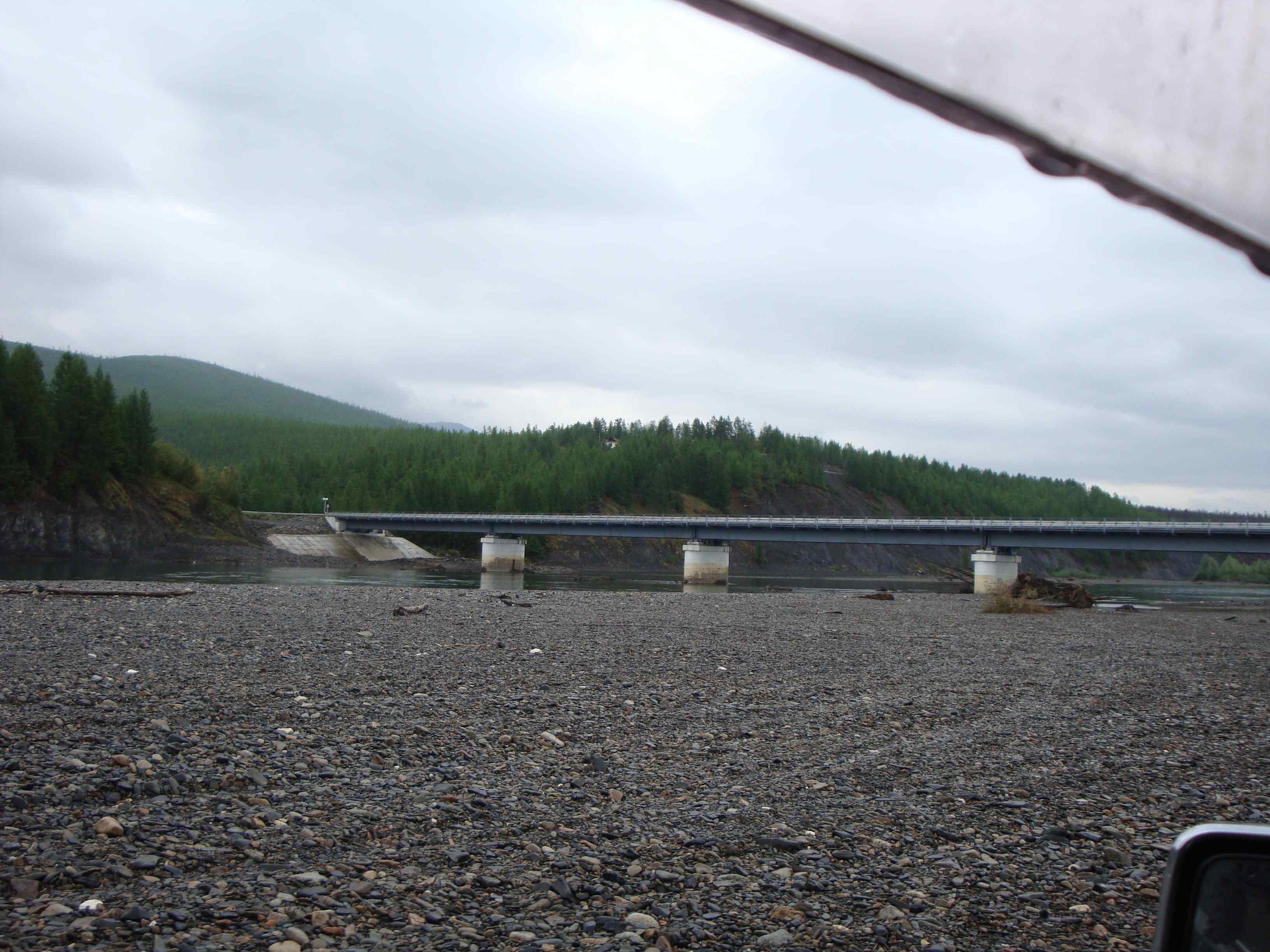 Время около 21. Поехали искать новый плес. У поворота на метостанцию ушли мимо гаражей по дороге, судя по карте, где Эмтыгей впадает в Аян-Юрях. В одном гараже то ли сарае топилась печка, сидел человек, охраняющий их (на вид лет 40-45).Проехали с км-полтора и уперлись в переезд через Эмтыгей. Мост разрушен, ехать только вброд.