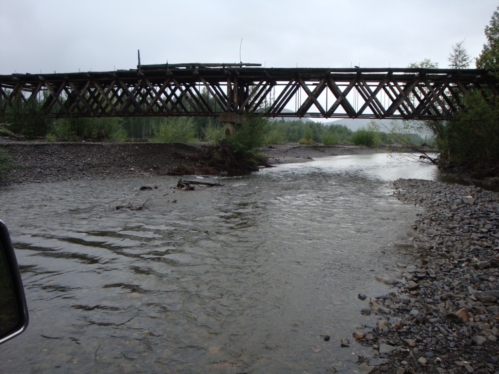Дорога до поселка – максимум 3-я передача, ямы, гребенка. Пожалели не раз, что свернули. Поселок находится в плачевном состоянии. На въезде встретили стадо коров и пастуха, который следил за ними. Из автомобилей – большая часть увиденных советского производства. Кафешки мы не нашли и, попетляв, поехали обратно. Кадыкчан-призрак встретил нас справа белеющимися домами. В него заезжать не стали, т.к. дорога проходила в стороне, а нам еще надо попасть на границу с Якутией. Пролетев поворот на старую федеральную дорогу, вернулись. С первых же км пошла гребенка, ямы, лужи, скорость движения 20-25 км/ч. Дорога узкая. Через км 4-5 встретили на стоящими Т-130 и сотку, рядом стоял балок. Откуда они ехали – мы так и не поняли. Включили хабы, 4WD, т.к. предстояли глубокие лужи и впереди р. Аркагала. Мост через Аркагалу разрушен, чуть выше его по течению переправа вброд – небольшая протока и основное русло, прошли без особых проблем – воды немного. Сразу на перекате покатили чуть вверх – стоянка на обед. Взяли удочки, обкидали пару ям. Несмотря на то, что перекаты были накатаны грузовыми машинами, тут мы ничего не поймали. Да и торопились. Разожгли костер, приготовили лапшу, чай, на все ушло не более 30 минут. Пообедав, тро-нулись дальше. Дорога по ту сторону реки была еще хуже. Весной или в начале лета бульдозер протащил сани – посреди дороги и с краю были полосы-ямы от полозьев саней. По низинам болото. Первый прижим….и перед нами открывается вид на Эмтыгей. Вода в реке более стоячая, чем горная. В некоторых местах на поверхность выпирает ко-ричневая глина, что отпугивает спускаться к воде, - полное болото, топь. Проезжаем прижим, спускаемся в низину. 2- передача, скорость 10-20 км/ч. Начинаются лужи. По бокам ил, по центру – ямы, но накатана колея. Идем на 1-й, чтобы не зацепить выпирающие бревна лежневки. Периодически по дороге приходится в буквальном смысле ехать по бревнам, с помощью которых выложена дорога. Доезжаем до отметки 778 км. Через почти 2 часа от того, как отъехали от Аркагалы, упираемся в прижим возле старой заброшенной метеостанции – выходим на реку Аян-Юрях (примерно км 60-70 выше нашей стоянки на нем по Теньке). Время уже около 7 вечера. Спускаемся к реке. Слева стоят гаражи, балок, кажется, кто-то живет. Подъезжаем к метеостанции, фотографируемся. Прикидываем, что дорога занимает до этого места 2 часа от центральной трассы, а про-ехали только около половины пути до границы с Якутией, решаемся остановиться на рыбалку тут и вечером вернуться на Аркагалу для ночевки. Иначе не успеем на Днепровский. Выезжаем на плес. Начинаем опробовать мухи. Вода тут на вид прохладнее, чем по Теньке. Течение более быстрое. Рыбалка увлекает нас на полтора часа. Это время пролетает незаметно, так как хариусом река насыщена достаточно. Каждый второй-третий заброс сопровождается вытаскиванием хари-тона. Приходится кидать подалее от берега, т.к. вблизи клюют «шпроты». Итог – около 50 харитонов у нас на берегу. -------------------- Каждый сам выбирает свой путь
