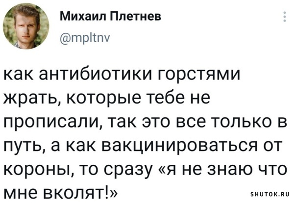 10 - новые случаи за сутки 8528 - всего выздоровело 117 - всего умерло 24044 - завершили вакцинацию Почему нужна обязательная вакцинация? Потому что, если вы не пройдете вакцинацию, то её за вас пройдут солдаты НАТО. Суббота. Проснулся не выспавшимся, голова раскалывается. Опять мои антитела всю ночь тусили и нажрались... Земля перенаселена. Антипрививочники, не делайте прививку! Помогите спасти планету! Они жили бы долго и счастливо, но один из них решил, что прививаться не надо. -------------------- Политики – словно подгузники. Их надо почаще менять. И по той же причине.