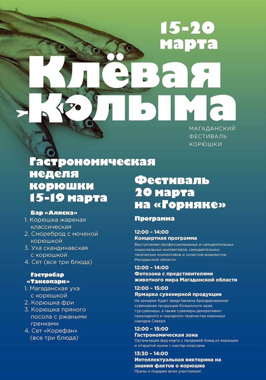Чемпионат по ловле корюшки пройдет в Магадане 20 марта в зоне отдыха «Горняк». Об этом «МП» рассказала начальник отдела развития туризма агентства по туризму Магаданской области Юлия Егоркина. - Принять участие в соревнованиях смогут 200 человек в два этапа, по 100 участников в каждом. После завершения рыбалки организаторы будут взвешивать улов по нескольким номинациям. Также предусмотрена и праздничная программа, а вместе с ней и гастрономическая зона, где известные рестораны города будут предлагать гостям чемпионата блюда из рыбы, - пояснила Юлия Егоркина. КАК ПРИНЯТЬ УЧАСТИЕ? Принимать заявки для участия в чемпионате начнут с 12 марта, сообщили «МП» в министерстве природных ресурсов и экологии Магаданской области. Подать заявку может любой желающий старше 18 лет: В электронной форме, направив заявку на адрес электронной почты Адрес электронной почты защищен от спам-ботов. Для просмотра адреса в вашем браузере должен быть включен Javascript. - до 24-00 часов 19 марта;На бумажном носителе - в министерство природных ресурсов и экологии Магаданской области до 20 марта по адресу ул. Пролетарская, д. 14 с понедельника по пятницу с 09.00 до 17.45, перерыв с 12.30 до 14.00, телефон 8(4132)607191;20 марта с 09.00 до 10.00 в месте регистрации участников.НОМИНАЦИИ Победители соревнований будут определяться в 6 номинациях: 1. «Лучший рыболов корюшки» - по самому большому весу всего улова корюшки; 2. «Навага - тоже рыба» - по самому большому весу всего улова наваги; 3. «Лучшая рыбачка» - по самому большому весу всего улова рыбы (корюшки и наваги) среди женщин; 4. «Лучший рыбак» - по самому большому весу всего улова рыбы (корюшки и наваги) среди мужчин; 5. «Самая крупная корюшка» - по самому большому размеру одного экземпляра корюшки из улова; 6. «Самая крупная навага» - по самому большому размеру одного экземпляра наваги из улова. - Кроме того, с 12 по 19 марта в ресторанах-участниках мероприятия будет проходить неделя корюшки, - сообщила Юлия Егоркина. - Что это значит? В этих ресторанах люди смогут прийти и заказать блюда из корюшки по спеццене. -------------------- Пейте чай и всё пройдёт......