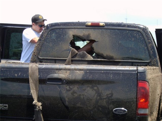 и на последних фотках видно что стекло с нутри выбито значит с зади прилетело ему