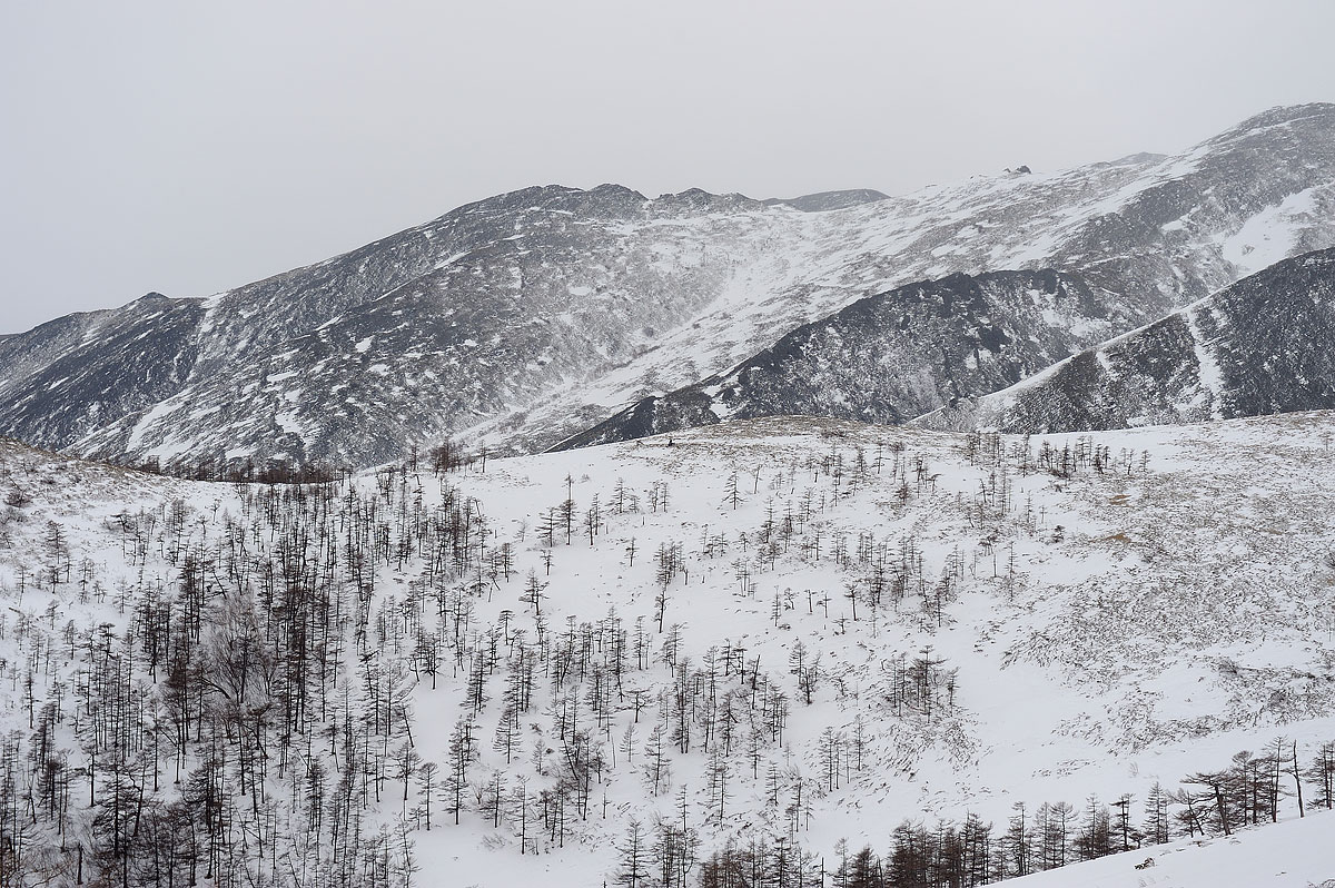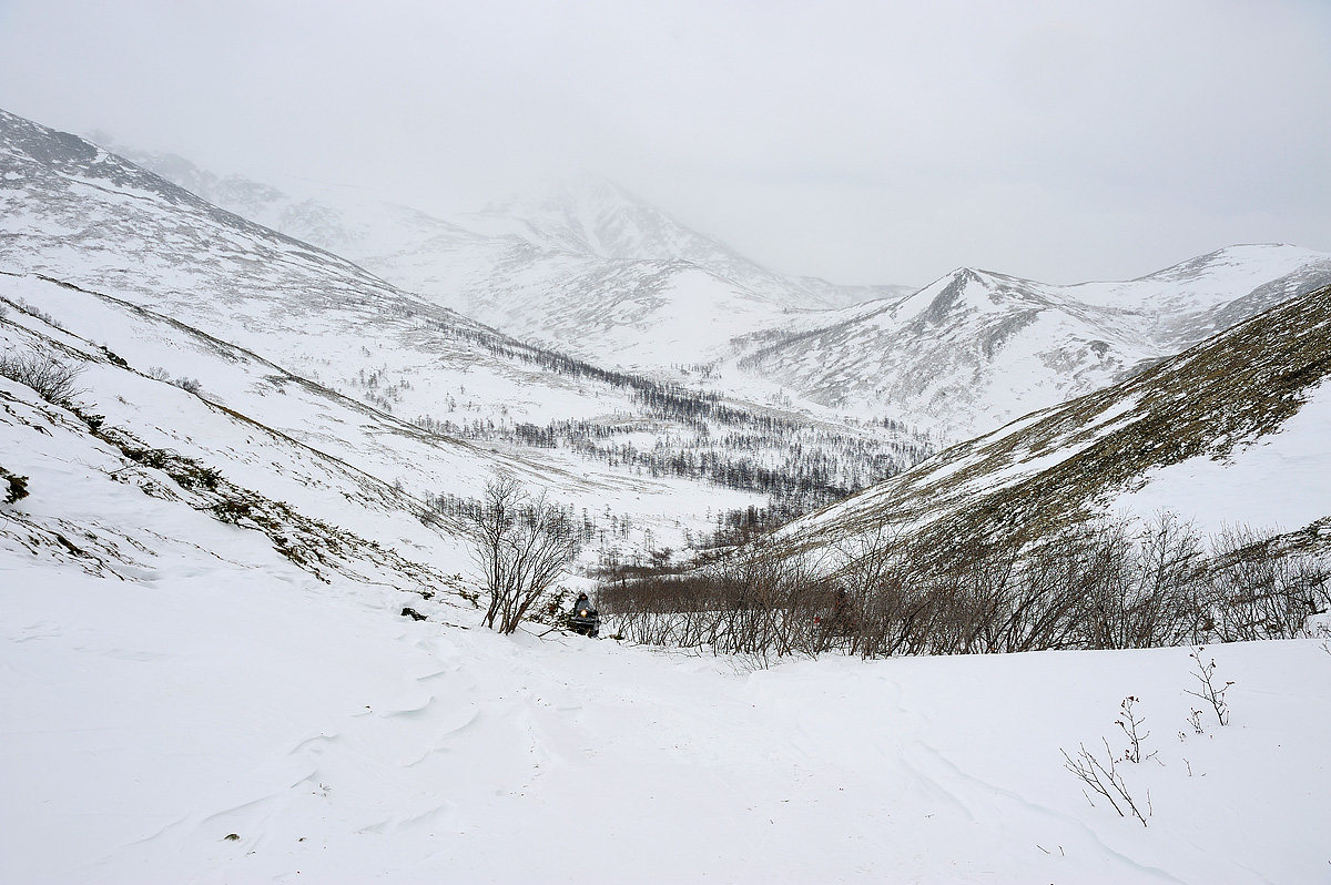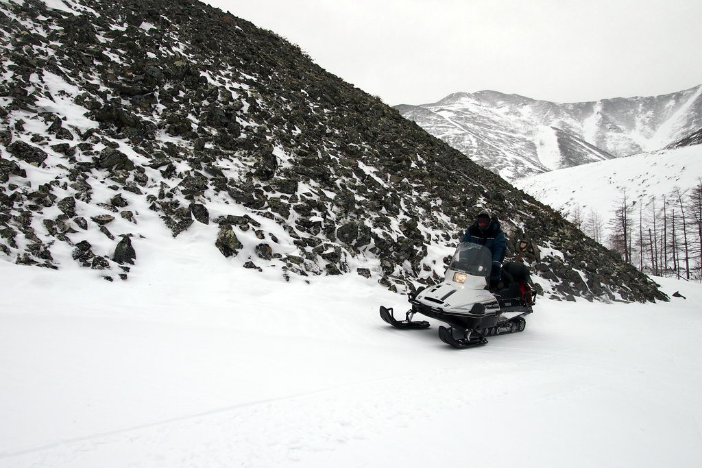 Цитата(DvK @ 24.3.2013, 1:47) ссылка доступна только зарегистрированным И вот что получилось: ссылка доступна только зарегистрированным В 9-15 на шашлычке было два викинга и я. Чуть позже подъехал Николай на пикапе с Ямашкой. Выехали на 10 минут позже намеченног срока. Когда пересекли Дукчу и углубились по заметенному путику в лес, начал один снеж валиться, плюс с Николаем связался Денис Асс, прилипший где-то до ГАИ. Ямашка ушла спасть Асса, как я понял. Далее мы двинули втроем. Местность знал, вел по своим же тряпочкам на деревьях, до Лесной Школы везде по старым дорогам и просекам. По верхам хорошо задувало и заметало, потому не до фотографирования было как-то. Кстати, в первый подъем за ЛЭП я вышел в одного без остановок, а вес у кота с полным баком, канистрой и шанцевым инструментом - как у сухой Прошки. Был вторым по сухому весу. На одном из озер откопали встреченный домик, сели чай попить укрывшись от ветра, там нас и нагнал Дима Двк. После озер срезали до старой дороги, которая начинается на 28 км осн. Трассы и ведет на пос. "Дробь" ("32/30" или пос. Верхний Сердях на картах). По пути к остаткам поселка, на который даже некогда ходил рейсовый маршрут, поднялись на приметную отдельно стоящую сопочку, с останцем на вершине. "Каменная Баба", "Сердяхский Идол" и т.п. названия приписывают этой формации Пока двигались правым краем полей, решали куда бы можно было бы заехать с бОльшим толком и меньшим расходом топлива. Пропустив два поворота, которые ведут под вершину 1367 м. Решили попытаться перевалить в истоки р. Уптар. Группа в начале подъема, на фоне едва проглядывающей через снег вершины 1367м "Пик Танкистов" Это "Двойная Уптарская Пирамида", вершина к западу от ПТ. Почти доехал до гребня, но снег кончился совсем. По стланику тоже можно ехать, но компания остановилась далеко позади ранее. Вернулся на снег выпилив лыжи из стланика. Вернулись и перевалили в долину Уптара через "Олькие Ворота", на том перевале еще косой балок стоял. Попили еще раз чай, причем колбасу, сало и сладкое грызли многократно жаднее . Нагуляли аппетит Пересекли долину Уптара и заскочили на Чертово Ущелье В ОБХОД НАЛЕДИ, через перевал. Заехали не без труда, а траверсируя его, перевернулся пару раз на застругах+общий уклон склона. Ставить на лапы пришлось через руль, вниз по склону, зажав тормоз. Штрааашно - вдруг так и покатится... только листвяны и остановят тогда его В цирк "Чертова Ущелья" мы заехали по ручью справа от моренного вала. Удивительно, но на верху, в цирке, сотворенном древним ледником был почти штиль, по сравнению с основной частью маршрута. Вышли с него через пологий перевал слева по ходу движения. Спустились по лесистому распадку и закруглились по ручью вдоль столбов старой телеграфной линии. Обратно с ЧУ вернулись через наледь. От пос. Уптар срезали по лесу на ЛЭП220кВ, где заправились с канистр Викинги и отлил 10 л бензина из бака Диме и поехали биться вдоль ЛЭП. Тут я уже почувствовал, что "приехал", и в прокладывании путика практически не участвовал, пасмурно+сумерки=мало фоток. Расход по такому снегу конечно дикий, особенно у авангарда. Но заезда на сокольскую заправку мы избежали (хотя не скрою, переживания определенные были, и грела мысль, что позади идет группа с некоторым запасом топлива, да и остаток маршрута весь вдоль трассы) Я свои 65 литров так и не пополнял из заначки, а даже н