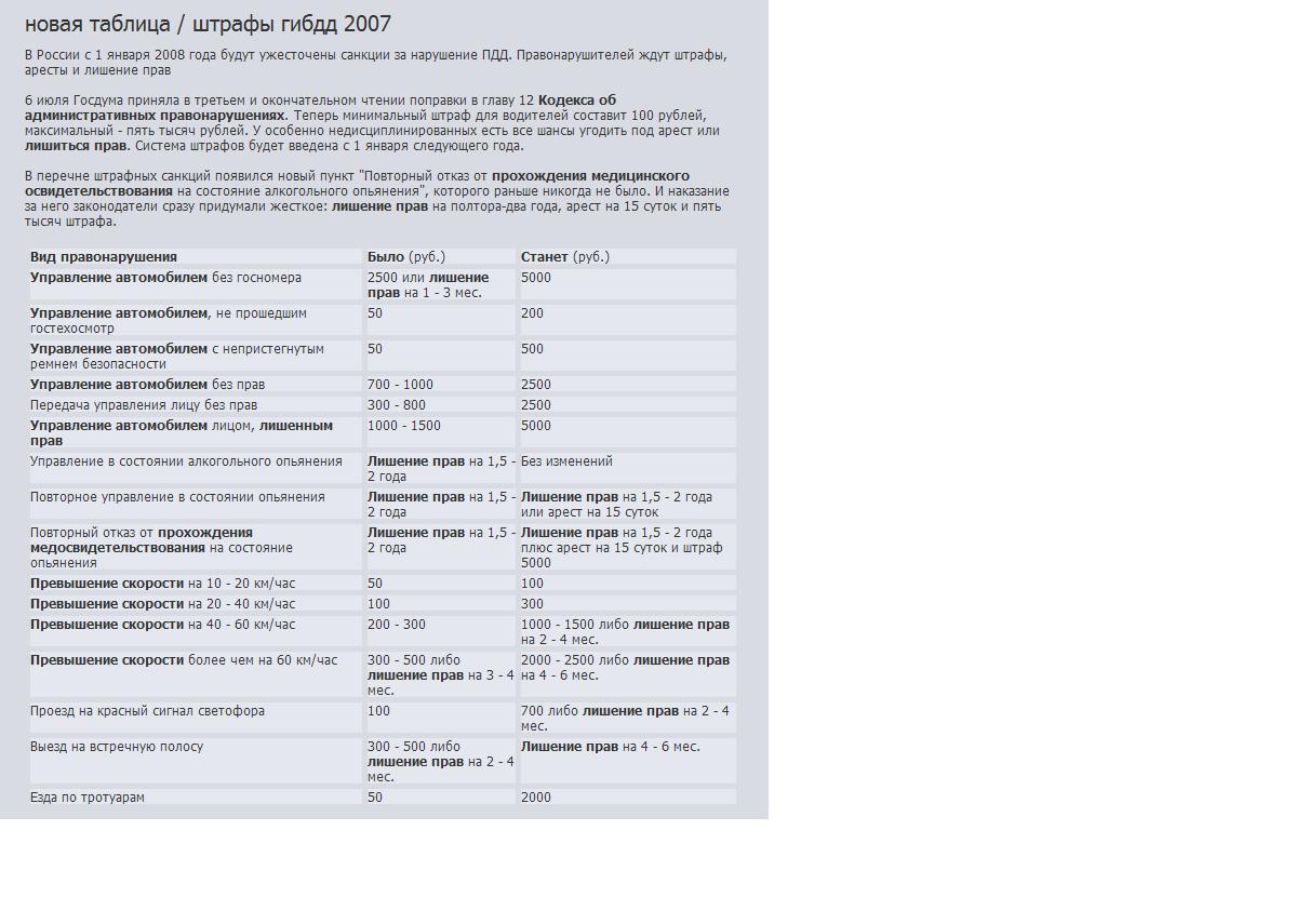Управление транспортным средством (ТС), не зарегистрированным в установленном порядке предупреждение или 50 300 Управление ТС, не прошедшим государственного технического осмотра предупреждение или 50 500 Управление транспортным средством, эксплуатация которого запрещена - 1000-1500 Управление ТС без талона техосмотра, документов на право управления ТС, регистрационных документов и полиса ОСАГО 50 и задержание ТС 300 и задержание ТС Управление ТС с нечитаемыми, нестандартными или установленными с нарушением регистрационными знаками предупреждение или 50 300 Управление ТС при наличии неисправностей или условий, при которых эксплуатация запрещена 50 300 Управление ТС водителем, не пристегнутым ремнем безопасности 50 или предупреждение 500 Управление ТС водителем, не имеющим права управления транспортным средством (за исключением учебной езды) 700-1000 2500 или административный арест на 15 суток Управление ТС водителем, лишенным права управления транспортным средством 1000 - 1500 2500 или лишение прав на 1,5-2 года, или административный арест на 15 суток Передача управления ТС лицу, заведомо не имеющему права управления транспортным средством 300-800 2500 Управление ТС водителем, находящимся в состоянии опьянения и не имеющим права управления, либо лишенным права управления задержание и 700-1000 административный арест на 15 суток Пересечение железнодорожного пути вне переезда, выезд на железнодорожный переезд при закрытом или закрывающемся шлагбауме либо при запрещающем сигнале светофора или дежурного по переезду, остановка или стоянка на железнодорожном переезде 500 либо лишение прав на 3-6 месяцев 2500 либо лишение прав на 1,5-2 года Другие нарушение правил проезда через железнодорожные переезды 100 500 Выезд на перекресток или пересечение проезжей части дороги в случае образовавшегося за перекрестком затора предупреждение или 50 500 Превышение скорости движения на 10-20 км/ч 50 300 Превышение скорости движения на 20-40 км/ч 100 500 Превышение скорости движения на 40-60 км/ч 100-300 1000-1500 либо лишение прав на 1-1,5 года Превышение скорости движения более чем на 60 км/ч 300-500 либо лишение прав на 3-4 месяца 2000-2500 либо лишение прав на 1,5-2 года Движение по автомагистрали на ТС, скорость которого менее 40 километров в час, остановка на автомагистрали вне специальных площадок для стоянки предупреждение или 100 предупреждение или 300 Движение на грузовом автомобиле с разрешенной максимальной массой более 3,5 тонны по автомагистрали далее второй полосы справа, учебная езда по автомагистрали предупреждение или 100 предупреждение или 300 Разворот или въезд ТС в технологические разрывы разделительной полосы на автомагистрали либо движение задним ходом по автомагистрали 300-500 1000-1500 Невыполнение требования ПДД уступить дорогу ТС, пользующемуся преимущественным правом проезда перекрестков 100-200 1000 Проезд на запрещающий сигнал светофора или запрещающий жест регулировщика 100 1000-1500 или лишение прав на 1-1,5 года Невыполнение требования ПДД включить указателя поворота перед началом движения, перестроением, поворотом, разворотом или остановкой предупреждение или 50 предупреждение или 300 Разворот или движение задним ходом в местах, где такие маневры запрещены предупреждение или 50 500 Невыполнение требования ПДД уступить дорогу транспортному средству, пользующемуся преимущественным правом движения предуп