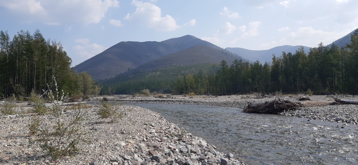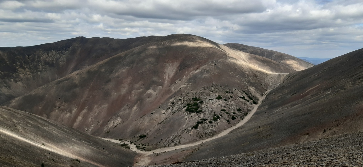 До горы от машины около километра шел в болотниках, переходя через Донышко. Затем начинается небольшой лес со стлаником, уже когда начинаешь подъем. В сочетании со следами медведя на песке возле реки становится немного очково. Но ведь медведь явно приходил ночью, а днем ничего страшного - утешал я себя, примкнув к Сайге-12С магазин с пулевыми патронами. И действительно - никакого медведя. Зато есть поваленные старые деревянные столбы ЛЭП с кучей проводов, которые как забор - едва нашел место, чтобы пролезть через них. Гора в остальном довольно удобная для подъема, виды открываются неплохие. |