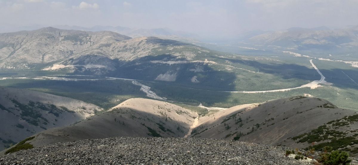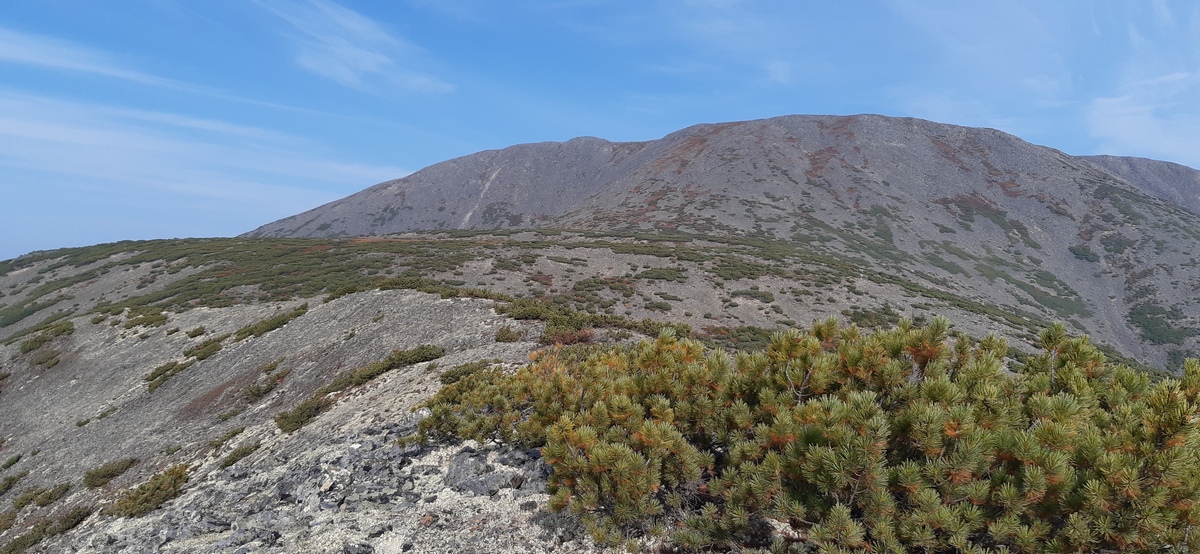 До горы от машины около километра шел в болотниках, переходя через Донышко. Затем начинается небольшой лес со стлаником, уже когда начинаешь подъем. В сочетании со следами медведя на песке возле реки становится немного очково. Но ведь медведь явно приходил ночью, а днем ничего страшного - утешал я себя, примкнув к Сайге-12С магазин с пулевыми патронами. И действительно - никакого медведя. Зато есть поваленные старые деревянные столбы ЛЭП с кучей проводов, которые как забор - едва нашел место, чтобы пролезть через них. Гора в остальном довольно удобная для подъема, виды открываются неплохие. |