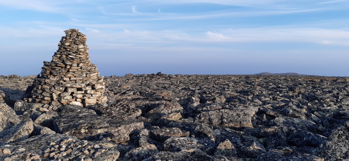 Не доезжая Спорного от федералки отходит дорога на Стан-Утиный. Где-то в её середине находится утинский перевал, с которого начинается путь на расположенную рядом гору Столовую. Решили подняться на неё, чтобы понять, почему такое название. Высота горы 1479 м. После преодоления первых двух отрогов попадаешь на первый "стол" из горной тундры. Затем следует чередование курумника и более мелких "столов". И наконец, преодолев последний крутой отрог, попадаешь на самый верхний "стол", состоящий из горной тундры и гранитных валунов, на вершине которого находится сложенная из камней пирамида.Она довольно большая - явно не за один день её сложили. Там на гранитных глыбах выложены мелкими камнями какие-то слова, цифры, из которых удалось четко причитать "...1959, Лысенко..." Неужели это геологи тех лет выложили? Никогда раньше не встречал подобного. Горы Колымы, вероятно, хранят множество тайн.