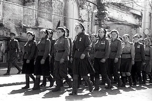 30 мая 1945 года. Германия. Первая демобилизация. Медицинские сестры на пути к поезду, который повезет их на Родину |