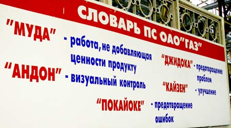"Заводской словарик газовцев пополнился новыми словами. Муда – работа, не добавляющая стоимости продукту. Андон – визуальный контроль. Покайоке – предотвращение ошибок. Причем тут новая «Газель»? Все просто! Эти слова – часть философии предприятия, призванной неустанно повышать качество продукта. А продукт – легкие коммерческие автомобили семейств «Газель» и «Соболь», которые получили новое исполнение «Бизнес»...." -------------------- Стой! кто здесь?