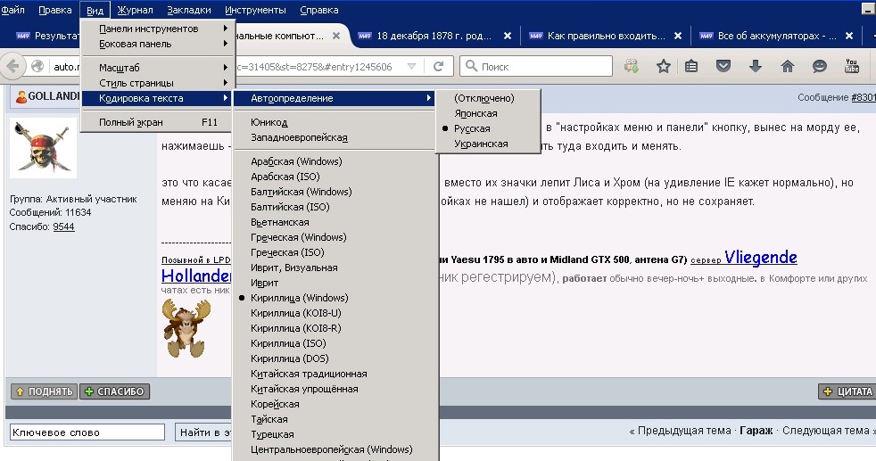 где в Огненной Лисе (Хроме) кодировку текста сменить можно? нашел в "настройках меню и панели" кнопку, вынес на морду ее, нажимаешь - меняешь, но при переходе на другую страницу надо опять туда входить и менять. Цитата это что касается моего сервера и русских буковок - вместо их значки лепит Лиса и Хром (на удивление IE кажет нормально), но меняю на Кирилицу Windows (через кнопку, в настройках не нашел) и отображает корректно, но не сохраняет. не знаю кто у тебя "мой сервер",но понятна некорректная настройка кустарно собранного сервера. Без достаточно подробной информации о самосборке дальше говорить смысла не вижу. Спасибо! — GOLLANDEC