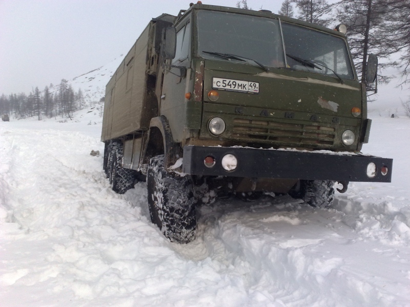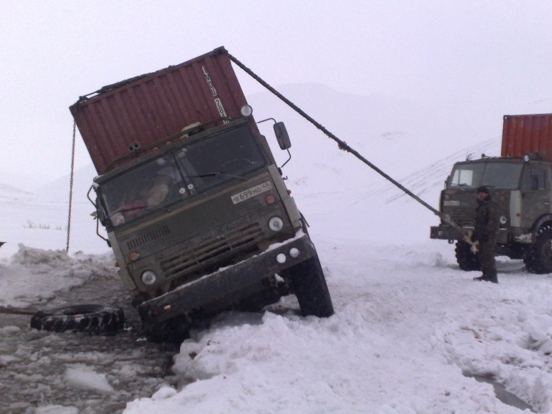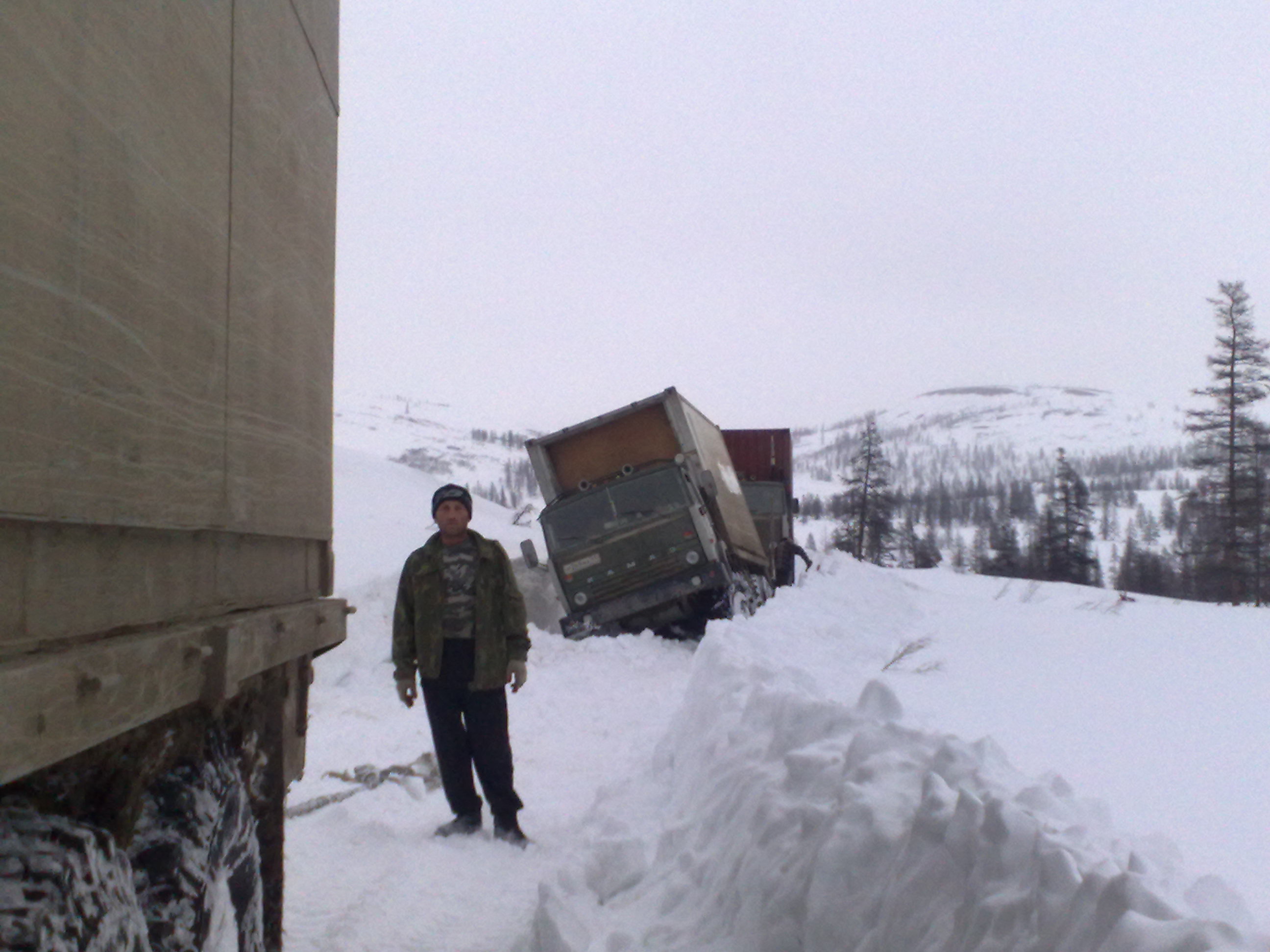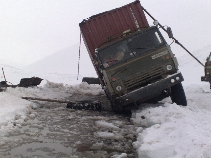 От Сучков До кубаки-растояние хде то точно 280 верст.Зимник был отличный в начале это я потом понял т.к через месяцок его уже не было и был сплошной летник..Ну начнём с того что проехав всего лиш 50 км, уже всё начало таять и поплыло Оно всё ето местами,мы в колоне 4 полноприводных монстров бездорожья которым и снег и дождь нипочём,ехали с одной мыслью вернутся домой поскорее и без поломок)) Но тут одна машина переезжав очередную преграду воды грязи, рюхнулясь жестоко в яму(ручей)проталину карочее канавкуу))в итоге был пробит хз как передним редуктором поддон(Фак его),дизель во время заглушили масло само собой вылелось и решив оттащить на сухое чистое место начать ремонт подранка...Время заняло около 6 часов.Всей командой специалистов и камазистов мы сняли поддон и вдоваться в подробности не буду чё и как, кароче замутили вторую пробку которая держалась весь рейс на геремтики с резинкой...Но это еще не все так как Камаз сильно врюхался, повело мост передний который еще поломался разломался внутри еще на Капрановской перевале.. (Забыл сказать)))..С помощью Кубакских цепей мы его поставили на место дергая Камаза туды-сюды ослобив канешно стремянки)) После всеого этого я еще успел заметить в моём колесе камушек скалистый что б его..пришлось бортировать колесо и под вечер когода солнце уже село и похолодало мы попив чайку двинулись лалее в путь опасаясь тех же самых больших луж со страхом не оказаться на в такой же ситуации заново))Дорога на Кубаку составила 1.5 суток..Так как я Держал на хвосте подранка без переднего моста с пробитым поддоном было очень тяжело(постояный свет в глаза от зеркал)Но тут спасла меня рация Мидланд GX 500 с выносной антенной которая на растоянии более 5 км(Это не рекламма господа)Он сообщал мне о всех остановках и погрешностях...и я ему тож самое..Т.к Сайгаку без передка ох как сложно ехать... Вечром мы были на Кубаки, выпили по сто грамм вотки и спать крепким сном..На утро мы чуток разгрузились нас накормили в хорошей столовой и хорошей едой и мы поблагодарив всех двинулись на рудник Кварцевый,который находится в 180 км от кубаки..Т.к про дорогу\ нам сказали одно-что только почистили половину пути и с подранком нам будет тяжко,мы не унывая .т.к как за баранкамми настоящие мужики,Мы ринулись далее!!На Кварцевый дорога идёт из одной траншеи пробитая нашей рашин техникой бульдогам 130-кой(Для дам ето-трахтор на гусеницах,думаю поймёте)))Ну проехав всего лиш 5 км на моём лице сошла та радость улыбка азарт что я блин впервые на таком зимнике Снега выше крышы,одна колея снегом валом-вижу разваленный этот самый бульдог перед перевалом...А это значит опять фал и подранка тягать в сопку боясь что я сам могу сорваться и тут будет опаа...мол затупил и т.д.А т.к.я шёл вторым + все блокировки у меня в норме работают +по рации мне подсказывают-Семёныч Газззз в поллл на пониженной проскочимммм!!!!)))Хы мы его(перевал) приодолели без фалов лопат и матов...До п.Колхозного это половина пути, мы прошли нормально, без потерь .т.к колея была свежей и превалы не задуты.. На Колхозном мы узнали что мы настигли колонну в числе 27 машин..которые уже как 3 недели пробиваются на Кварцевый..Мол дороги нету, Диз топлива нету и совести тоже...Впереди колона дорожников которые из 3 бульдозеров Китай техники Каты,Хитачи и Sem...А так как снега ну очень много они не могут пробить стар