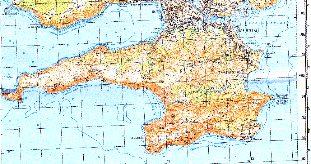 Полуостров Старицкого, масштаб 1:100000 (километровка: 1 клетка - 2 км).