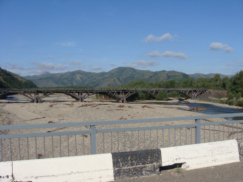 Выдвинулись из города в понедельник 12-ого июля в 6 утра, в составе 5ти человек на трех машинах: мой Сафарь, Патрол форумчанина D-imona и Сафарь форумчанина Zhikanа + 2 штурмана: Стас и Владимирыч. Сафари слегка подготовленные, а Патрол в полном стоке. Погода радовала солнцем и утренней прохладой, добрались до Палатки и повернули на Теньку. Первым пошел Патрол, потом я, потом Женя. Интервал между машинами растянули на пару км, что бы не глотать пыль впереди идущего. Некоторые участки теньки оказались на редкость пыльными, хоты в целом качество дороги было неплохим. Так неспешно и двигались со скоростью 80-90 км/ч, по пути снимая достопримечательности и виды трассы: Гений инженерной мысли, бревенчатый мост через Иганджу Армань в районе Мадауна. Тенька По дороге раза четыре пересекались с медведами, особенно улыбнул случай когда на обочине стоял ЗиЛ, под капотом у которого ковырялись два мужика, а за ними метрах в 50-ти спокойно по дороге разгуливала мамка с двумя медвежатами Участок трассы реконструируют, метров на 5 подымают полотно дороги, правда зачем это делается для меня так и осталось загадкой. Строят мост Белазы отсыпают полотно Кулинский перевал Добрались до моста через Кулу и устроили маленькую фотосессию: Опора предыдущего моста, этот мост по ходу третий Двинулись дальше, до сворота с Теньки осталось совсем немного. И вот она развилка, Тенька на право, а нам налево. Скорость резко упала, дорога используется только старателями и следить за ней никто не собирается... Сколько же тут грунта переворотили за 50 лет…дорога идет то по сопке, то выходит непосредственно на полигоны. Добрались до Гвардейца Виды конечно унылые, но на полигонах работает техника. Через 30 км проходим Токичан…снимать особо нечего Идем дальше, дорога уходит с полигонов в сопку, и становится хуже. Меняем ся с Патролом местами, как самое слабое звено ставим его по середине. Теперь я иду первый, патрол второй, а Женин Сафарь замыкает колонну. Пошел дождь, во время преодоления очередной лужи, в колее Патрол намертво садится на мосты…приступаем к эвакуации, дождь заряжает сильнее…неприятно. Решили выдернуть вперед рывком стропой, разворачиваюсь, сцепляемся с жертвой, разгоняюсь и вуаля Деваться некуда…достается лопата, разматывается лебедка и после небольших инженерных работ сдергиваем Патруля лебедкой . Едем дальше, дорога спускается в долину, полигоны заканчиваются, дождь тоже:) На встречу едет КрАЗ наливник, тормозим что бы распросить про дорогу, но кразист оказался хорошо поддатым и конструктивного диалога не получается Доходим до очередной развилки, на право Мария Раскова, нам опять налево. Свернули…дальше цивилизация заканчивается, интенсивность движения по этому участку 3-4 машины в год, не больше, хотя дорога хорошая…местами. Иногда получалось разгоняться до 50 км/ч. Бетонные мосты стоят, но с обсыпанными заездами, деревянные разрушенны, так что проходить реки только в брод. На дороге попадались знаки и километровые указатели. Так без особых приключений добираемся до отворота ведущего в конечную точку нашего путешествия, дорога уходит прямо и где то там обрывается (месные говорят размыло ее несколько лет назад), а мы поворачиваем на право, начинаются самые жопные финишные 40 километров пути. Появляется много луж и проток, Тактика следующая: я сходу на небольшой 
