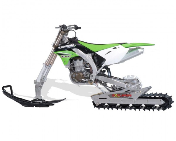EXPLORER продолжает продвигать в массы альтернативный взгляд AD Boivin на зимнее катание и позволяет превратить практически любой эндуро, кроссовый мотоцикл или супермото в снегоход, при помощи замены переднего колеса на лыжу, а заднего на гусеницу. Инженеры провели немало часов над проработкой комплекта. Результат впечатляет: EXPLORER можно установить на мотоцикл с двигателем от 250 до 800 «кубиков» примерно за час. Комплект рассчитан так, чтобы использовать при установке все детали от стандартного мотоцикла. Таким образом, такие детали мотоцикла, как: тормозная система, задняя вилка или амортизатор, остаются оригинальными. Увеличение массы мотоцикла на 20-35 килограмм (зависит от модели) значительно улучшает сцепление гусеницы с грунтом. Разумеется, комплект обладает широкими возможностями по настройке. Так, расположенные вдоль гусеничной системы шесть штифтов, позволяют достаточно легко сдвигать ее вперед или назад, приспосабливая к различным типам местности. Направляющие задней подвески имеют выпуклую, дугообразную форму, что позволяет уменьшить пятно контакта на твердом снегу. Для передачи вращательного движения на гусеницу, используется простая и логичная система соединений, жестко связанная с задней вилкой мотоцикла, осью и тормозной системой. Крепеж адаптера лыжи позволяет в достаточно широких пределах поднимать переднюю часть мотоцикла – до четырех дюймов. Лыжа оснащается двумя коньками. При наклоне мотоцикла до 6 градусов, за счет шарнирного соединения лыжа не меняет своего положения, оставаясь параллельно поверхности снега и готовя его для гусеницы. Как отмечают в AD Boivin, комплект EXPLORER позволяет адаптировать мотоцикл к практически любому типу поверхности – снегу, песку, грязи… Например, для езды по песчаным дюнам, можно оставить переднее колесо, но поддержать его гусеницей, а для езды зимой по снегу, установить полный комплект. -------------------- |