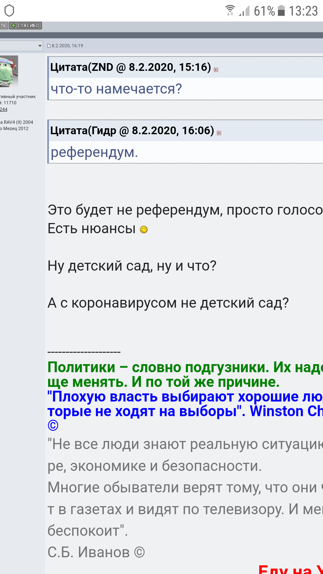Так, по моему, меры по профилактике и борьбе с коронавирусом превзошли все мыслимые и немыслимые пределы. Потери для экономики будут страшные. Да и покупательная способность населения резко упадет, а у многих кредиты, и доходы от зарплаты до зарплаты и т.д. Конечно, можно сказать, что на жизни людей нельзя экономить, но и опускать уровень жизни людей ниже плинтуса тоже не комильфо. По России, по данным интернета, 114 заболевших. А смерти от обычной пневмонии и от многого другого не считаются? -------------------- АвтоМобиль СГВ XL-7 2003 г.в., 2,7 л. АКПП