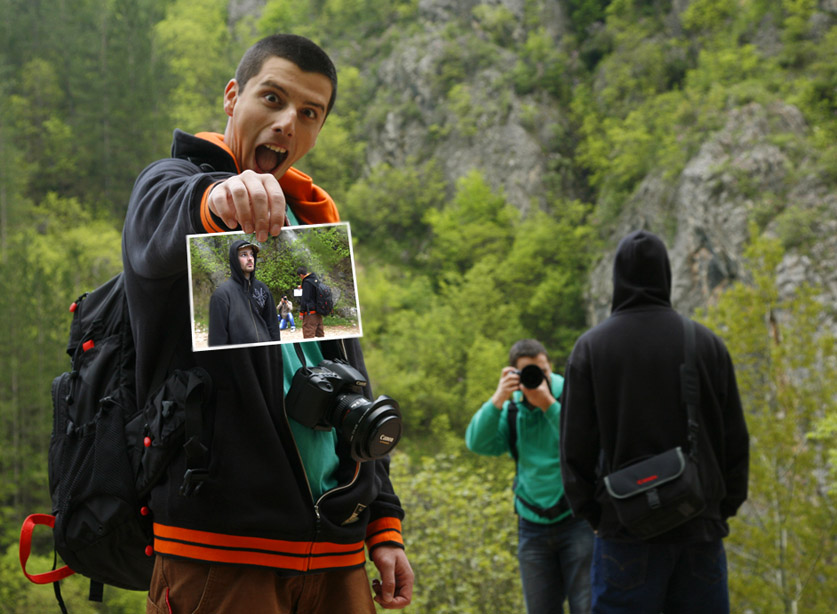 Ну да. Свет-то рассеянный сверху, фотка д.б. темней. И затемнений около держащих её пальцев нет. Но самая фишка - это физиономия парня, который держит фотку