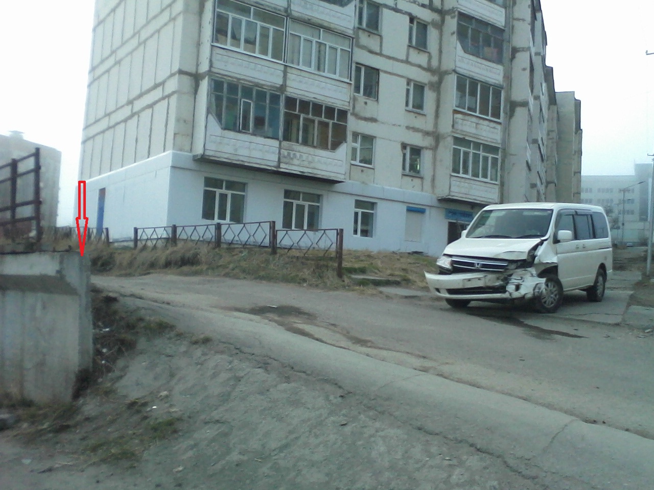 Фото сделано вчера вечером. Портовая 25/21. Стрелка - место "невписания" в поворот, там все следы осталены. Автобус до сих пор стоит... Видать это бетонное ограждение послужило алкотестером |