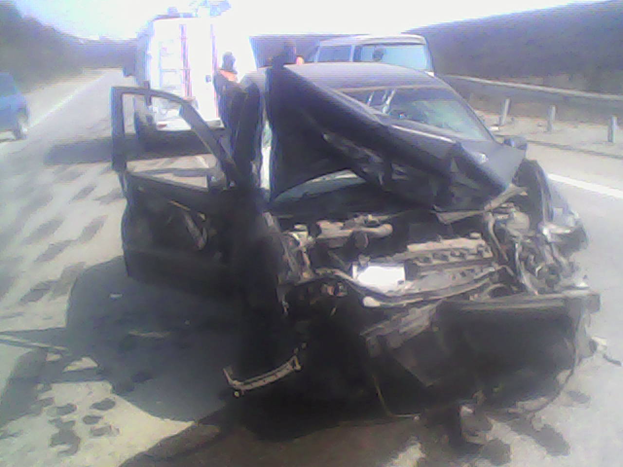 Сегодня по дороге в аэропорт (примерно 26 км, первая прямая от города, после памятника дорожникам) - машина похожая на короллу 2 или что то подобное сильно влупилась в ограждение. Стояла скорая. Надеюсь, что никто не погиб. Машина была HONDA LOGO, ни кто не погиб,у водителя что то с ногой.водила был с перегаром... вот фото. извиняюсь за качество... -------------------- Я никому не буду доказывать,что я хороший! Пусть мне кто-нибудь попробует доказать,что я плохой...