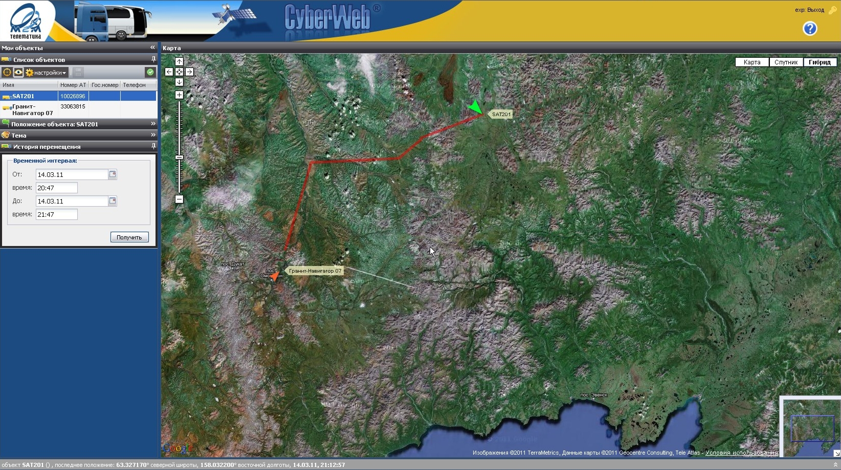 с 13,03,11 20:47 по 14,03,11 21:47 Объект SAT201 точка отправления: 14.03.2011 8:32 нет информации о населенном пункте координаты: широта: 62.510330 долгота: 155.793200 точка прибытия: 14.03.2011 21:12 нет информации о населенном пункте координаты: широта: 63.327170 долгота: 158.032200 стоянка время простоя: 2 ч 18 мин 40 сек. нет информации о населенном пункте с 08:32:08 14-03-2011 по 10:50:48 14-03-2011 участок пути время в пути: 4 ч 20 мин 20 сек. пробег: 82 км. 779 м. с 10:50:48 14-03-2011 по 15:11:08 14-03-2011 стоянка время простоя: 2 ч 26 мин 39 сек. нет информации о населенном пункте с 15:11:08 14-03-2011 по 17:37:47 14-03-2011 участок пути время в пути: 1 ч 2 мин 0 сек. пробег: 15 км. 764 м. с 17:37:47 14-03-2011 по 18:39:47 14-03-2011 стоянка время простоя: 36 мин 30 сек. нет информации о населенном пункте с 18:39:47 14-03-2011 по 19:16:17 14-03-2011 участок пути время в пути: 1 ч 56 мин 40 сек. пробег: 35 км. 272 м. с 19:16:17 14-03-2011 по 21:12:57 14-03-2011 Общий пробег: 133.8 км. Время простоя: 5 ч 22 мин. Время в пути: 7 ч 19 мин. -------------------- куплю Ниву, недорого. 892Ч69287О5