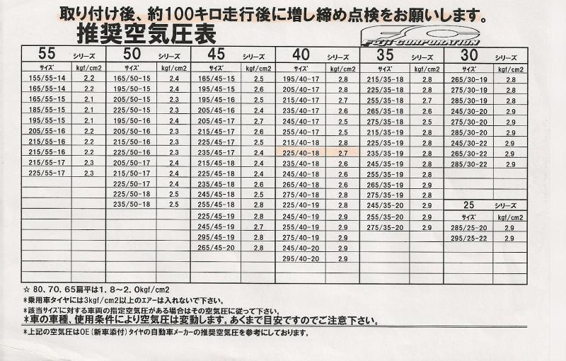 Японская таблица давления в шинах |