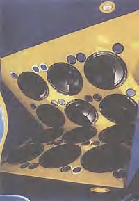 SPL-автомобиль Проект машины, предназначавшейся для победы в конкурсе по звуковому давлению, зрел долго. Окончательная ясность пришла после посещения выставки "Car + Sound" в германском городе Зинцхайм в апреле 1999 г. Платформой для звуковой машины стало то, что в прошлой жизни было автомобилем "ВАЗ 2108". У него имелись относительно пристойных кондиций кузов, двигатель и трансмиссия. Салон был в жутком состоянии, что оказалось как раз кстати: так или иначе все детали интерьера предполагалось выбросить и сделать заново. "Скорлупу" авто привели в порядок, покрасили синим металликом и нанесли боевую раскраску, не хуже, чем у гоночных болидов, с помощью местных (лефортовских, то есть) мастеров кузовных работ. И, помолясь, приступили к главному: тому, что внутри. Без большой натяжки можно сказать, что внутри кузова "ВАЗ 2108" оказался второй, перекрывающий все кузовные панели, кроме стекол. Дело в том, что материал автомобильного кузова, как бы почтительно мы к нему ни относились, - это все-таки жесть, не более того. Во всяком случае, когда предполагается работа внутри машины мощной аудиоустановки. А здесь чего-чего, а мощности предполагалось в достатке. Вся задняя часть интерьера занята корпусом сабвуфера. Его "рабочий" торец имеет форму своеобразной "гармошки", на плоскостях которой смонтирована "дюжина дюжин" - двенадцать двенадцатидюймовых сабвуферов Polk Audio EX12. "СТ-Вариант" - студия авторизованной установки акустики Polk Audio, поэтому ограничений в выборе моделей акустики не существовало. Стенку сабвуфера, выходящую в салон, сделали такой сложной формы сразу по трем соображениям. Во-первых, в одной плоскости все 12 головок разместить бы не удалось. Во-вторых, при такой форме все динамики работают на объем воздуха клиновидной формы, что повышает создаваемое ими звуковое давление за счет увеличения акустической нагрузки диффузора: тот же механизм, что и в рупорных излучателях. И, наконец, ребра между отдельными частями "сложенной" панели корпуса образуют мощные элементы жесткости, умеряющие вибрации и связанные с ними потери звукового давления. Внутри салона все поверхности выполнены заново. Пол закрыт мощной плитой из MDF толщиной 30 мм, из этого же материала сделаны новые обивки дверей. Точнее, теперь они стали не обивками, а основными панелями, определяющими жесткость всей конструкции, а тонкая стальная "кожа" просто придает дверям форму. Сиденье в машине одно - водительское, и сделано оно из стеклопластика с минимумом мягких звукопоглощающих поверхностей - таковы законы жанра борьбы за децибелы. Полностью заново изготовили и приборную панель, которая теперь не элемент декора, а мощная поперечная балка, во многом определяющая жесткость кузова при вибрационных нагрузках. Задняя стенка сабвуфера, выходящая на пятую, багажную дверь, - это основа "приборного отсека". На наклонных стенках раскинулись шесть усилителей басовой группы - двухканальных Signat RAM3. Сигнал с головного устройства Clarion 9255 подается на первый усилитель, а пять остальных включены цепочкой с использованием линейных выходов. Седьмой усилитель - четырехканальный Signat RAM2 - "голосовой". Его нагрузка - трехполосная акустическая система Signat SCS2000. Два канала работают на 8-дюймовые мидбасы через встроенный в усилитель активный кроссовер, настроенный на частоту около 300 Гц, а два других - на СЧ- и ВЧ-г