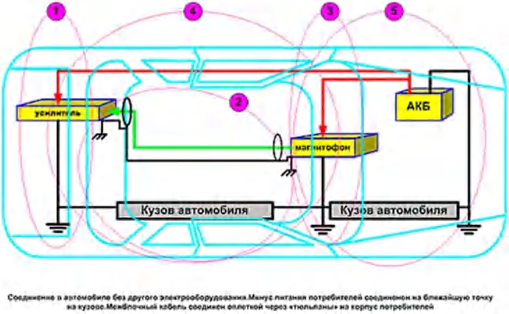 Итак переходим в реальную обстановку -но для начала переставим аппаратуру в пустой кузов без дополнительного электро-оборудования И рассмотрим обычную ситуацию когда в качестве точки заземления используется ближайшее место на кузове автомобиля и смотрим что изменилось.. Контура 1 и 3 перестали иметь общую точку заземления и заработали общий контур 4 в котором появилось сопротивление кузова между точками заземления усилителя и магнитофона. Этот участок конечно же состоит из ряда кузовных деталей соединенных точечной сваркой или болтовыми соединениями. А значит переходное сопротивление этого участка будет зависить от качества соединений которое в свое время изменяется в худшую сторону с возрастом автомобиля.. Это приводит к одному - чем больше сопротивление на этом участке - тем хуже и тем больше уровень помехи. Аналогично с контуром 5.Те же признаки и проблемы. В контуре 2 помимо традиционной ситуации когда в качестве межблочника применяется простейший кабель с одним экраном(оплеткой) соединенным с обеих сторон на корпус тюльпана-добавляется контур обьединяющий усилитель-кузов и магнитофон. Это самый помехо- уязвимый контур и к нему мы еще вернемся отдельно.. Для того что б не загромождать рисунок овалами я не стал показывать достаточно еще мелких контуров-неизбежных при таком раскладе но менее значимых в проявлении помехи.