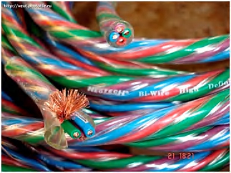 Вот еще одна классика по акустическим проводам. Витые счетверенные. Удобно тянуть при разнесенке.. одна пара на мид-другая на пищалку)) И обратите внимание сколько мелких проводов в одной жиле..Не сосчитать и они все сплетены в маленькие косички и те в свою очередь в более крупные!! В результате суммарная площадь поверхности кабеля очень большая, а это как мы знаем благотворно влияет на качество звука.. Ток же бежит по поверхности и когда проспект широкий и многорядный то и пробок нет.