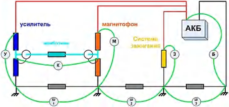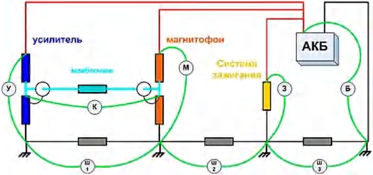А здесь правильно землится "система зажигания"? Если сравнивать с предидущим рисунком то получается необходимо править штатную проводку? В идеале да! Это касаемо в основном моторного отсека. Тогда уж в идеале дотянуть землю магнитолы до земли аккумулятора, и избавится от Ш3. Это куда проще, чем перелопачивать землю всей штатной электрики.