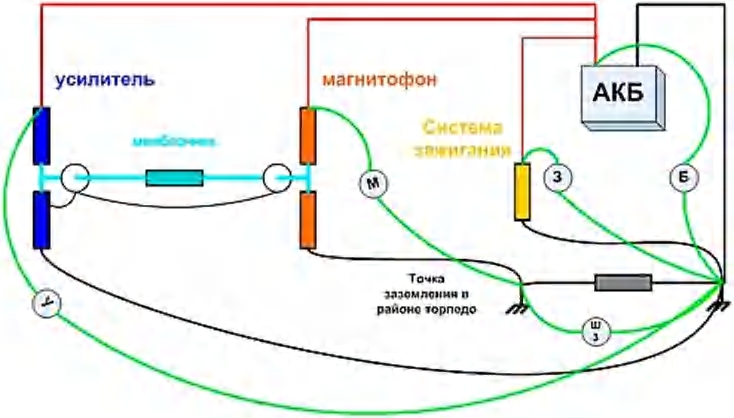 Методика исключения контуров - это сведение точек заземления в одно место....а так как на практике это сложно-то разбиваем электрику на группы и землим их в своих общих точках...В общем это и есть в авто...но вот то что мы добавляем - нарушает ситуацию и значит все новое - а конкретно музыку надо стараться свести в одну точку.
