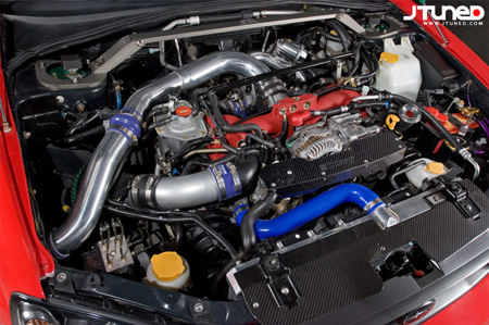 Impreza WRX STi получила 6-ступенчатую МКПП и обновленные элементы трансмиссии, особенностью которой являются электронные системы Vehicle Dynamics Control (VDC), Subaru Dynamic Chassis Control Concept (Subaru DC3), дифференциал повышенного трения (LSD) и активный центральный дифференциал Driver Control Center Differential (DCCD). Subaru решили не убивать в новой WRX STi “спортивность” и внедрила возможность отключения всех помощников за исключение ABS. Subaru Impreza WRX STi в заводской комплектации весит 1480 кг и оборудуется 18-дюймовыми алюминиевыми коваными дисками с резиной Bridgestone RE050A размерностью 245/40R18. Система управления двигателем получившая название SI-Drive (SUBARU Intelligent) предлагает три режима работы (Intelligent, Sport, Sport Sharp). Например, если в режиме Intelligent водитель активно работает педалью газа, система увеличивает предел давления турбины. Грубо говоря, SI-Drive – встроенный буст-контроллер работающий в адаптивном режиме. Премьера WRX STI завершила всю линейку Impreza в Японии, предыдущие модели Impreza 15S, 20S и S-GT доступны с июня месяца текущего года. Представляем Вашему вниманию ещё один профессиональный тюнинг, этот автомобиль на самом деле похож на дьявола, поэтому наif статья и носит название Red Divil. В этой статье будет представлена всеми любимая Subaru Impreza о которой Вы не только слышали, а не которые даже и видели. Компания APR, уже известная тем, кто посмотрел “Тройной форсаж”, благодаря идее моноприводного Lancer Evolution, представила журналистам еще один свой проект: Subaru Impreza STI в боди-ките Widebody SS/GT. До того, как стать выкрашенной в красный цвет от BASF ракетой, эта машина была стандартной Импрезой 2004 года выпуска, пусть даже и STI. Передний бампер с вентиляционными отверстиями для тормозов/масла APR Wide Body. Передняя нижняя карбоновая защита бампера APR. Карбоновые дефлекторы APR. Теперь, обходя ее кругами, можно заметить много мелочей, которые ничего не скажут новичкам, но значат многое для знатоков: карбоновые разделители порогов, выходные отверстия в передних крыльях для уменьшения лобового сопротивления передних колес, угол расположения заднего бампера, при котором общее воздушное сопротивление и завихрения воздуха в районе задних колес минимизируются. Авиакосмические инженеры были бы в восторге! Карбоновый задний диффузер APR. Карбоновый капот SEIBON. Краска BASF Custom 2 Stage Red. “Форма обусловлена функцией”, - вот ключевая фраза, которой можно было бы описать выпуклости STI, большая часть которых изготовлена из того же материала, что используется в реальных реактивных истребителях: углеволокно, оно же карбон. Передняя губа и двойные дефлекторы прижимают нос машины к земле при езде. Задний диффузер использует принцип Вентури, усиливая поток воздуха из-под днища машины и таким образом прижимая к земле и ее заднюю часть. Если и этой прижимной силы недостаточно, то есть еще антикрыло GT-300 на багажнике. Одним словом, сорвать машину с нужной траектории будет трудно. В том, что касается сцепления с дорогой, она просто монстр. Карбоновый спойлер шириной 170 см APR GTC-300 EVO Spec. Конечно, все эти аэродинамические хитрости были бы совершенно бесполезны на машине, которая не разгоняется больше, чем до 130 км/ч. Но трепещите, воздушные потоки! В бой вступают запчасти HKS. Вот уже огромный фронтальный интеркулер HKS встречает ветер, что называется, лицом и попутно охлаждает поступающий от турбины воздух. Где-то внутри напевает титановый выпуск. Свои ноты в это пение вн