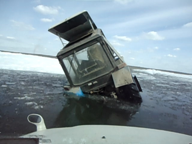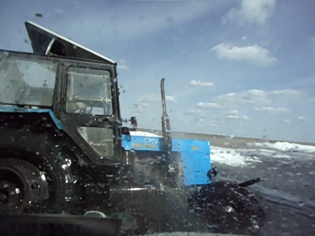 В прошлом году, 10 апреля она выглядела так: Местами лужи, но судя по тому, что метрах в двухстах от берега на льду стоял тяжёлый бульдозер(на фото жёлтый, правее КАМАЗа), то толщина льда была более чем. Спасибо! — krokodil vasy Синегорец