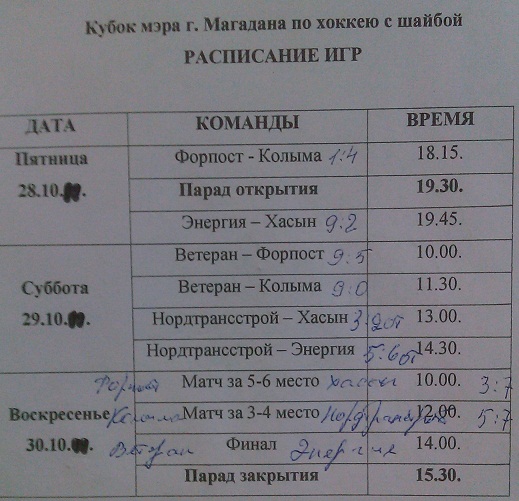 Для тех кто у нас интересуется хоккеем, буду сюда скидывать информацию о наших местных соревнованиях, про которые сам в курсе. Если есть кто-то, кто более близок к первоисточникам, то прошу поддержать. Обсждать тоже предлагаю здесь, дабы не плодить темы. Новость первая - сегодня в ледовом стартует кубок мэра г.Магадана по хоккею с шайбой. Расписание в виде фотки с сотика. С годом там напутано, конечно 2011, а не 2009. Первая игра сегодня в 18-15 |