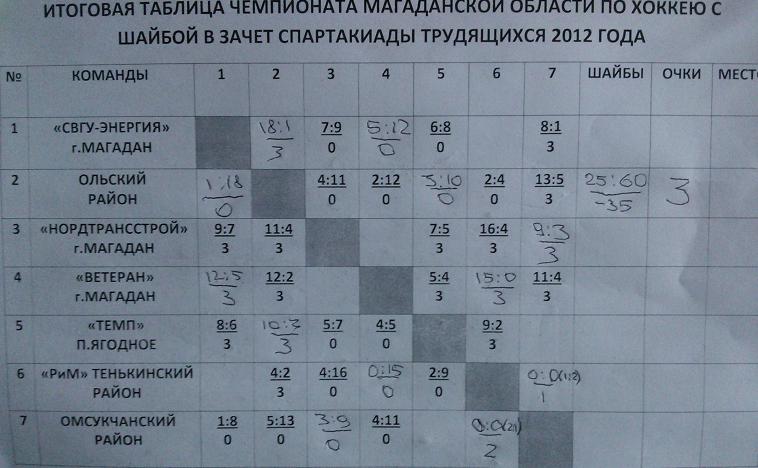 Ольский район - Омсукчанский район 12:5 "НордТрансСтрой" г.Магадан - Тенькинский район 16:4 "Темп" Ягодное - "Ветеран" г.Магадан 4:5 20 марта 2012 года "Темп" Ягоднинский район - Тенькинский район 10:2 "Ветеран" г.Магадан - Ольский район11:2 "НордТрансСтрой" г.Магадан - "СВГУ-Энергия" г.Магадан 9:7 |