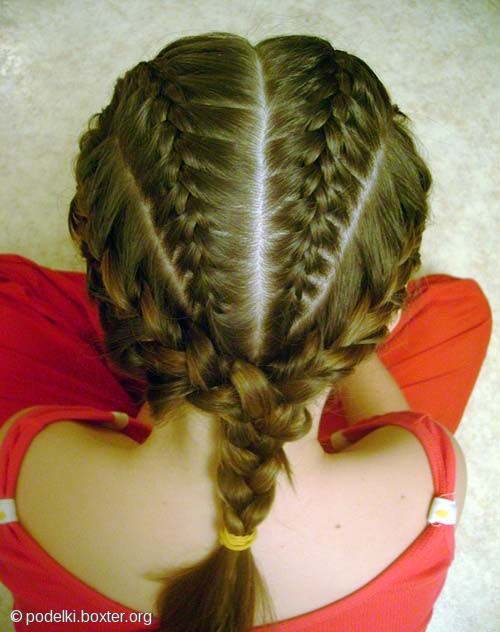 1. Волосы распределяем на две части вертикальным пробором. 2. Делаемдополнительный пробор в каждой половине от затылочной к лобовой доли. 3. Плести начинаем сзатылочной части. 4. На макушке делаемповорот и плетем в обратную сторону. 5. После выполненияплетения с двух сторон косички можно объединить в одну косу, а можно оставитьдве. -------------------- Стерилизуйте дворовых и домашних любимцев!