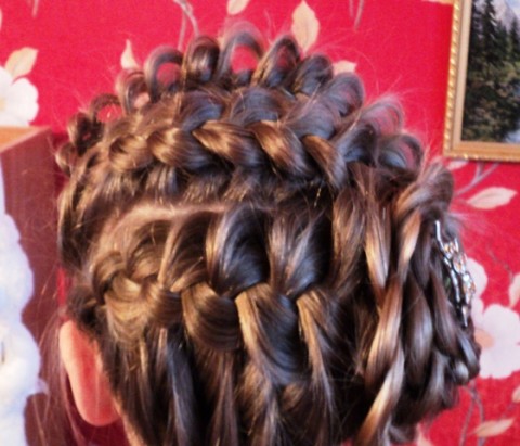 Особенно красиво эта прическа смотрится на мелированныхволосах, как здесь у моей Насти. Светлые косички на темных волосах). Для началаразделим волосы. Заберем в хвост волосы с правой стороны чуть ниже макушки, отвиска, и от макушки до шеи, захватывая примерно треть затылочной части. Изоставшихся волос нам надо сплести четыре косички вокруг головы. Начнем сверху.От правого виска отделяем часть волос вокруг макушки, остальные волосы уберемзажимом, чтобы не мешали, и начинаем плести от виска, делая подборы от макушки,не в плотную к голове, а чуть дальше, чтобы коса закрывала пробор. Плетем доконца, закрепляем косу резинкой. Отделяем еще часть, начиная с середины лба, иплетем так же, параллельно верхней косе. Третью косу плетем от виска, ичетвертую от уха. Не забываем - подборы делаем сверху! Итак, четыре косички мысделали, теперь возьмемся за пятую. Ее мы будем плести снизу вверх. Распускаемнаш хвост. Снимаем резинки с двух нижних кос, в меру чуть распускаем, делаемтри пряди из этих двух кос и начинаем заплетать простую косу. Подбор здесьделаем с двух сторон на каждый перекид. Со стороны головы вторые два перекида -это косы, первая и вторая, которые тоже надо чуть распустить. Так, ведем косучерез висок (подборы делаются с двух сторон!) и закругляем. Плетем косу доконца. Если хватит длины, можно сделать цветок. У меня не хватило, я просто закрепила шпильками и невидимками. Эта прическа плетется долго, руки устают) Но зато как хитрО и красиво) Сообщение отредактировал yuli - 8.5.2012, 15:17 -------------------- Стерилизуйте дворовых и домашних любимцев!