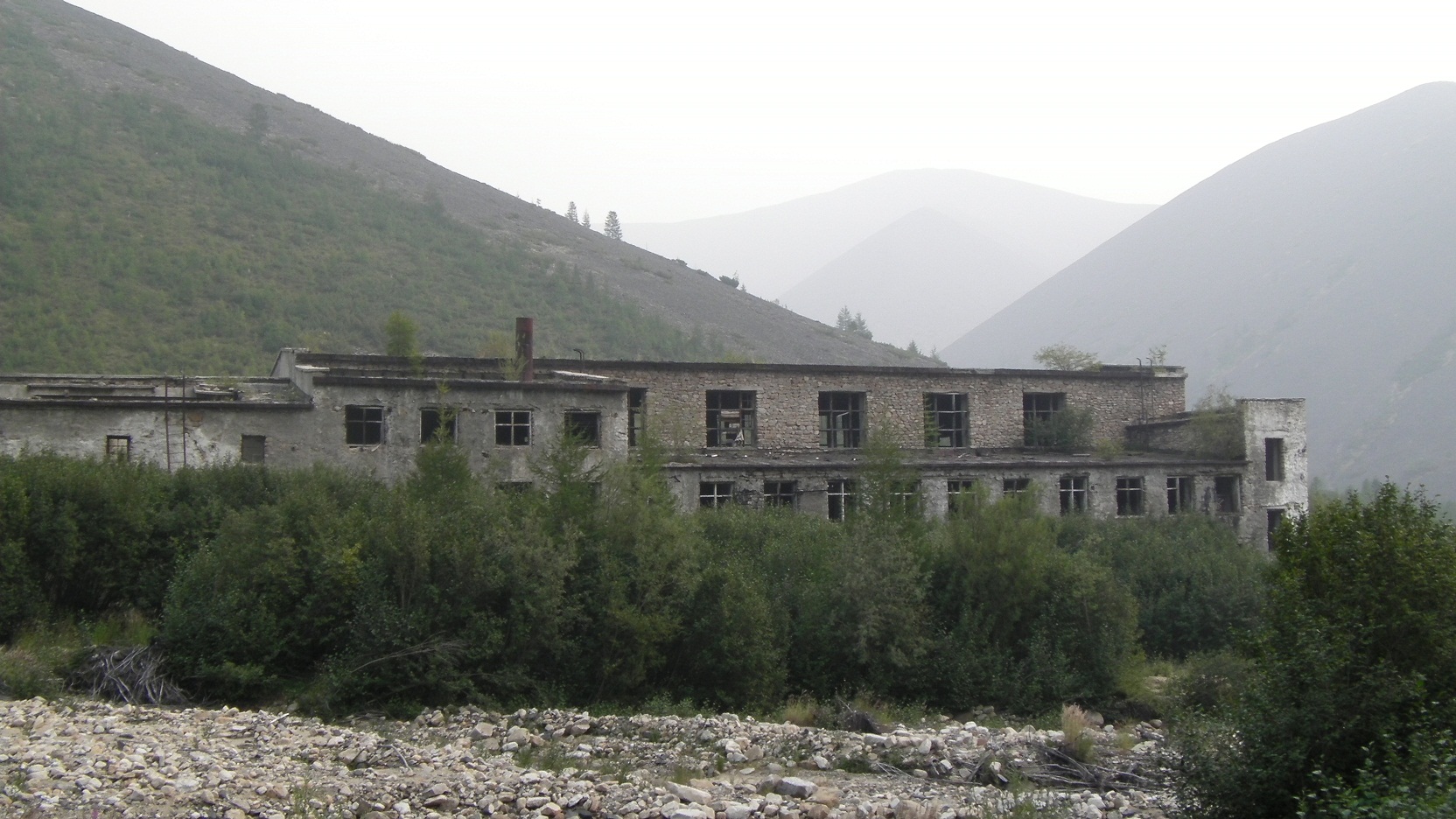 На выходных ездили по Теньке в сторону поселка Матросова, по пути заехали в лагерь Бутугычаг (Бутугычаг – исправительно-трудовой лагерь, входил в подразделение ссылка доступна только зарегистрированным. Лагерь существовал в 1945-1955 гг., в основном известен своими смертельными ссылка доступна только зарегистрированным рудниками) Примерно 222 км поворот перед мостом через ручей Террасовый, затем по заросшей, местами размытой каменистой дороге, еще километров 10 – точно не замерял. Доехали до здания фабрики – дальше дороги нет. Так как целью был беглый осмотр местных достопримечательностей, решили попасть в здание, обойдя его с левой стороны, пробираясь через густые заросли, окружавшие фабрику. Наткнулись на медвежонка, который с треском бежал к нам на встречу, после чего показалась и его мамаша со вторым. Через секунду мы уже стояли на более-менее открытом участке местности, запасаясь камнями. На наше великое счастье, медведица, забрав своё потомство, вышла немного ниже на русло ручья и неспешно поплелась в сторону сопки. После всего пережитого, желание на посещение здания пропало, решили вернуться к машине.