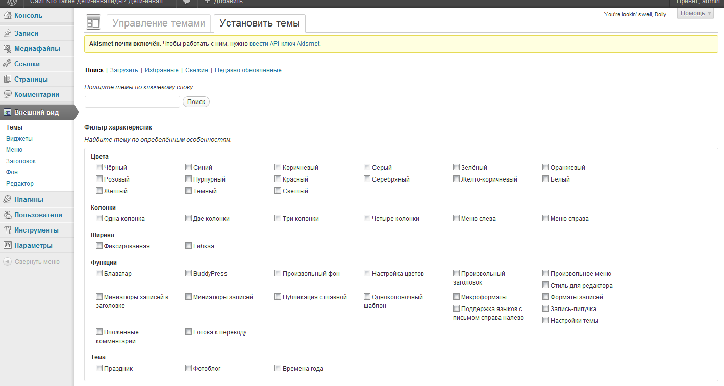 Тему добавить легко. Справа есть надпись "Управление сайтом" ты уже на нее не раз нажимал, ты попадаешь на страничку администрирования сайта. Там справа на ходишь надпись "Внешний вид", а потом нажимаешь "Темы". Вверху нажимаешь "установить темы". У тебя загрузится страничка с кучей галочек, там можно выбрать цвет, стиль и так далее... После того как поставишь галочки нажимаешь кнопочку внизу "Найти темы". И он тебе найдет по твоему запросу. В итоге ты увидишь кучу тем и под каждой надпись "Установить". Так они и устанавливаются. (можешь нажимать на картинки тем чтобы ее сначала посмотреть) Вот так должна выглядеть страница поиска тем: Напиши как получится Сообщение отредактировал hightway - 8.8.2012, 22:59 -------------------- Оформление полисов ОСАГО и КАСКО по ОЧЕНЬ выгодным ценам в ведущих страховых компаниях.