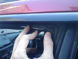 Нажмите для просмотра прикрепленного файлаА вот около зеркала заднего вида, этот ограничитель сразу бросится вам в глаза. Этакий выступ, приклееный к резинке японцами. Как будто с той же целью какую преследуем мы