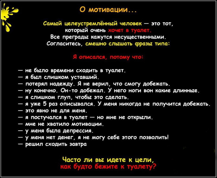 Под мотивацией, мне кажется следует понимать нечто широкое, всеобъемлющее, как простую и банальную формулировку "радость жизни" например, а не докапывается до частностей, категорий и понятий. Я последнее время все чаще прихожу к мысли что так и надо, коротко и лаконично, а самое главное емкостно выражать мысль. Поэтому повторюсь - человек который теряет мотивацию, превращается в чмо.