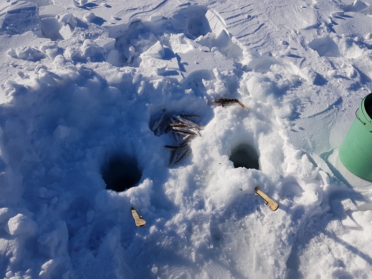 удочками RX-5 (61 см) с кольцами на блесны Стрекоза, на мелководье, навага клевала стабильно, по мере ее мигрирования под лунками.