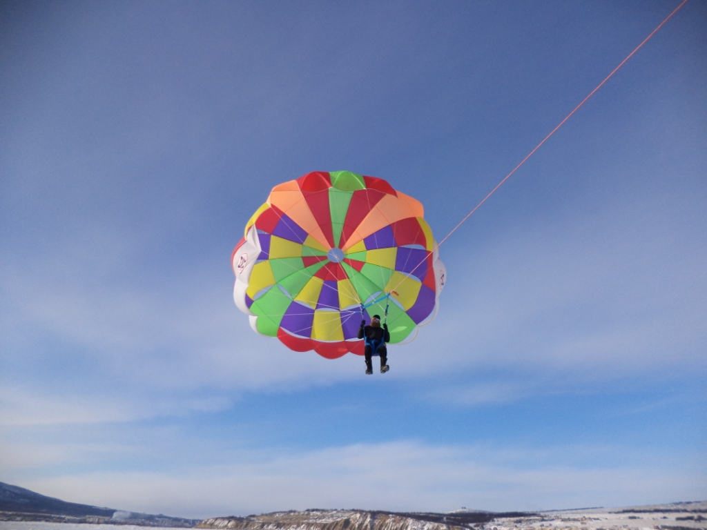 Хотите получить адреналина и множество эмоций, мы поможем вам с этим, зимой мы предлагаем Вам зимний вид парасейлинга. Высота подъема по желанию до 60 метров (ориентировочно 2 девятиэтажки). Во время полета пилот буксировщика выполняет для катающего на парасейле по желанию множество трюков: катание со сноубордом, с резким отрывом от земли, свободное падение на парашуте и тд.