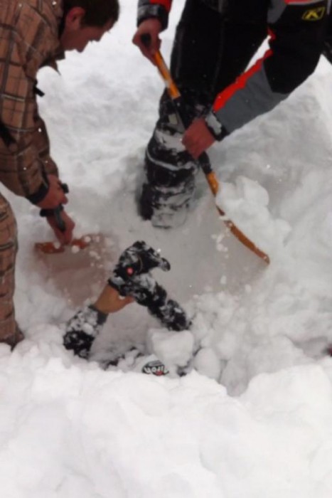 И тут я понял – щас пиз…нет. И точно – шапочка сорвалась и пошла вниз. Сначало показалось, что она совсем небольшая, но очень стремительно росла. Снизу закричали – “Лавина, бегите от снегоходов”. Мы рванули вниз и в сторону, что было сил. От снегоходов мы ушли, не ушли от лавины. Она сбила нас как крейсер утлую лодчонку. Стало темно. Я инстинктивно сгруппировался, упал на спину (10 лет дзюдо записали это на подсознании) и покатился в полнейшей темноте в плотной массе лавины. Затем все стало тихо. Я попытался пошевелиться. Это было тщетно. Я закричал, но даже себя плохо слышал. Это был склеп из снега. Нелепость была в том, что именно о снеге я и мечтал все прошедшее лето. Подкатила паника, стало тяжело дышать, на грудь давила масса снега. Вспомнил, что нельзя паниковать, поскольку воздух кончится еще быстрее. Немного успокоился. Попробовал поднять колени – тщетно. Выгнуться, пошевелить головой, руками – полная неподвижность. Опять паника. Я понимаю, что меня никто не видит и не знает где искать. Начинаю осознавать, что это может быть конец. И тут - о чудо я увидел, что снег просвечивается! Не знаю почему раньше я ничего не видел, может потемнело в глазах от давления или позже растаял снег на веках. Я лежал на спине и поскольку я сгруппировался - колени были поджаты к животу и руки были скрещены на груди, поэтому мне хватило сил сквозь снег пробиться кончиками пальцев. Воздуха было уже на пределе, точнее его уже не было, и тут я услышал моего напарника, который заметил кончики моих пальцев. Это было счастье! Напарник стал активно откапывать голыми руками мое лицо. Снег стал попадать в рот, некоторое время я не мог вздохнуть. Набрался последних сил и закричал – “Уберите снег со рта”. Он очистил снег – вздох, лица друзей, меня откапывают лопатами, поднимают, я говорю как сильно я их люблю, спрашиваю как остальные двое. Мне говорят, что их мало засыпало и у них уже все хорошо. Меня засыпало больше всех – 60 см. Я говорю, что молодцы – нашли за 1 минуту. На меня удивленно смотрят и говорят, что прошло 5-6 минут, до этого копали двоих других, которых было видно из-под лавины, меня видно не было. Странно сдвинулось время, может я был несколько минут без сознания – я не знаю и никто не знает.
