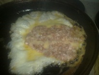 Нажмите для просмотра прикрепленного файла6. на яйцо в тарелку аккуратно выкладываем лепешку из фарша, сняв при этом одну часть пленки;