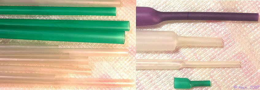 Допустимый диаметр сердечника кабеля находится в пределах 4-7мм и 5-6,5мм для проводников диаметром 0,8мм и 1мм соответственно и ограничен снизу пятью диаметрами проводника, а сверху диаметром готового кабеля с учетом внешней изоляции, т.к. это напрямую связано с конструкцией RCA разъемов. Полиолефиновые трубки необходимого диаметра и с достаточной для наших целей толщиной стенок наиболее просто получить из обычной термоусаживающейся трубки с кратностью усадки 2 и диаметром 10 или 12,4 мм (в зависимости от требуемого диаметра) путем их нагревания до полной усадки. При этом обязательно использование неокрашенных полиолефиновых термоусаживающихся трубок (в крайнем случае, цветных полупрозрачных) без клеевого слоя по причине того, что только в этом случае материал диэлектрической трубки будет иметь минимальную диэлектрическую проницаемость. Дополнительную информацию о термоусаживающихся трубках (термоусадке) можно найти на сайте www.termousadka.ru .