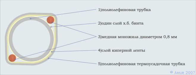 В конструкции кабеля для фиксации проводников навитых на центральную диэлектрическую трубку используется эластичная фторопластовая лента толщиной 0,2мм и шириной 15мм. Такую ленту можно легко приобрести в местах продаж сантехнического оборудования.