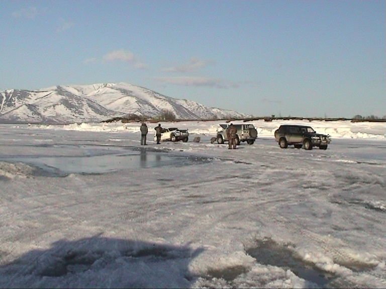 В ночь с понедельника на вторник по малой прошли переправу-отл. состояние. За два дня около 100кг. на двоих,основной подход среда с 12.30 до 18.00,ловилась по всей бухте. Назад по полной-водичка,и вообще....На янской стороне в яме выезда по правому ходу(напр. на янск) под водой трещина, в ней сидел крузак. Вытащили его с большими трудами. Переправа поганится-лучше по малой.На перевалах мыло,метель. Но в целом-кайф!