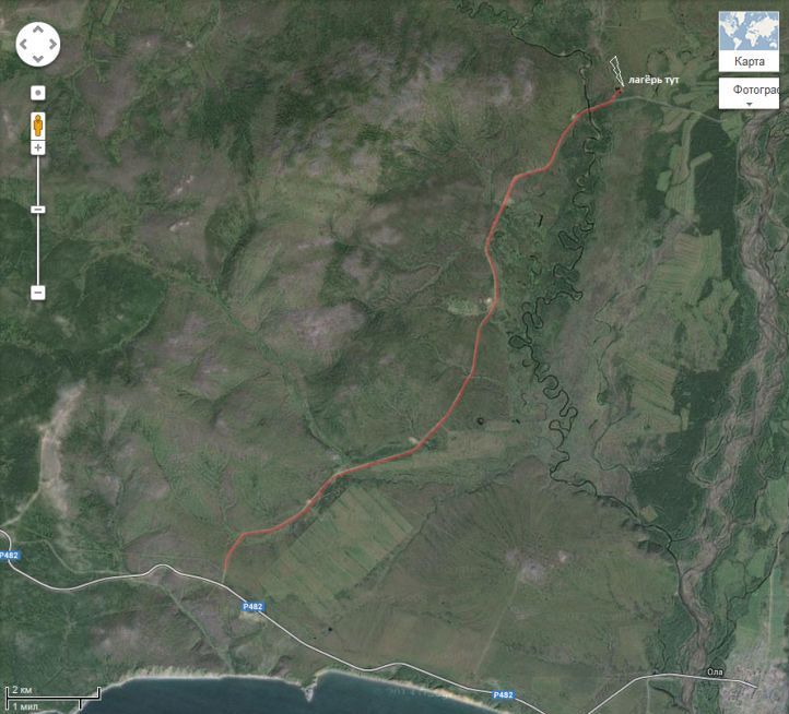 Координаты будущего лагеря N 59*41.8361 E 151*14.8083, на пальцах: поворачиваем с Ольской трассы в сторону Клёпки, за вторым мостом, который через Танон, налево, по укатаной дорожке за озером справа поворачиваем направо.